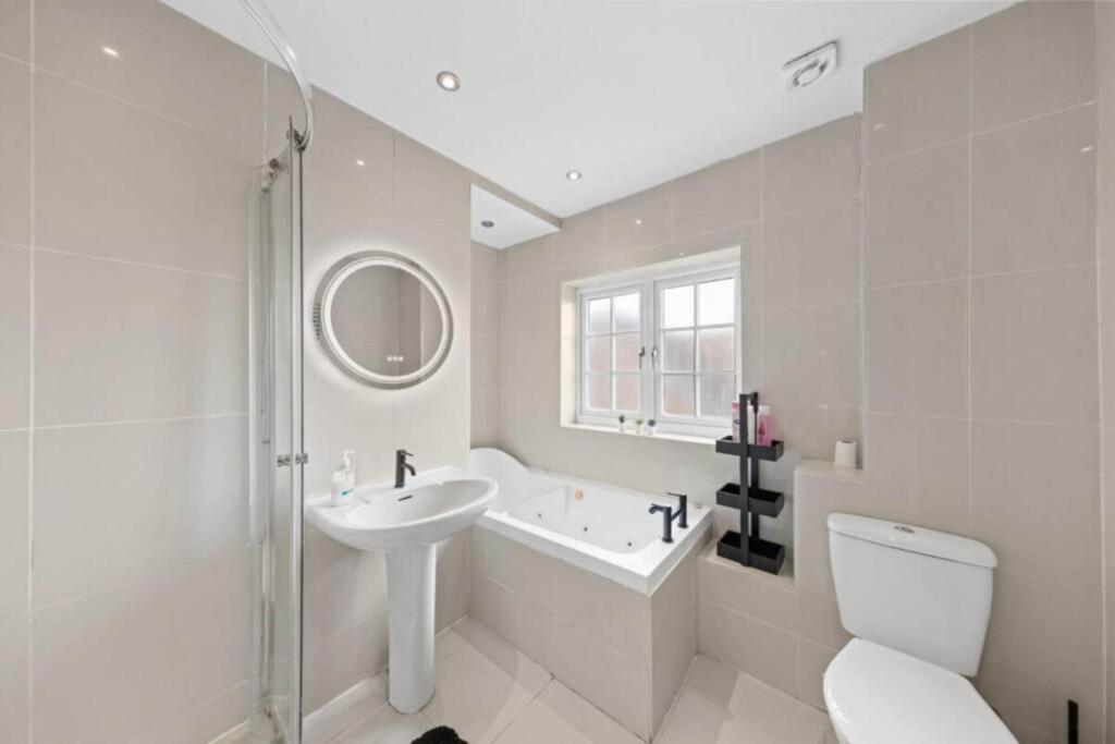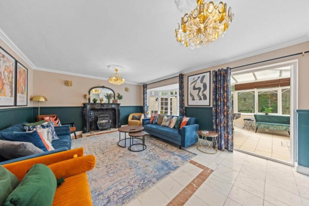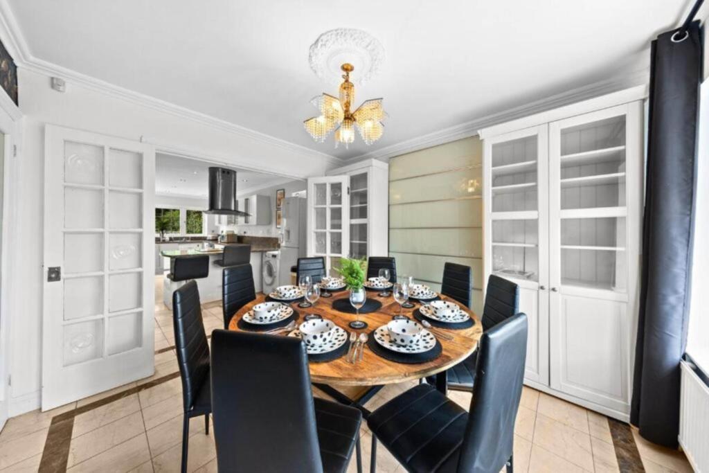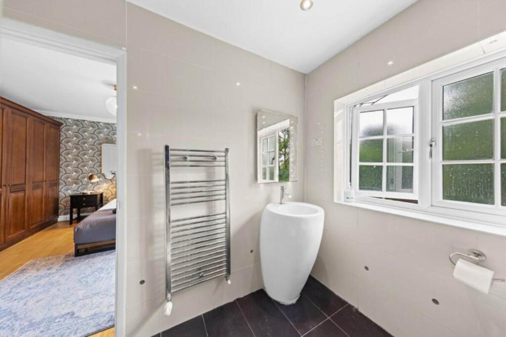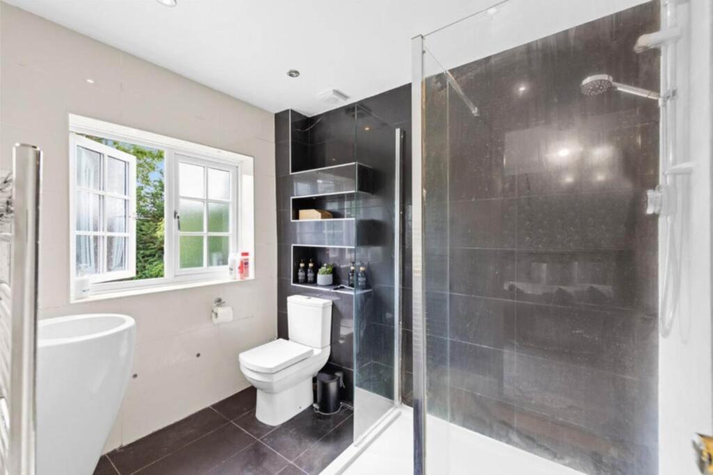 The property is a detached house with 5 bedrooms and 3 bathrooms. It is located on Deacons Hill Road in Elstree, Hertfordshire, an East Of England district. Elstree And Borehamwood station is located within 1km of the property. Several schools are located within a 2km radius, including Summerswood Primary School and Yavneh Primary School (Ofsted: Outstanding). The property appears to be in good condition, with modern interiors and well-maintained bathrooms. However, the conservatory looks like it may need some attention. The property has a good-sized garden.