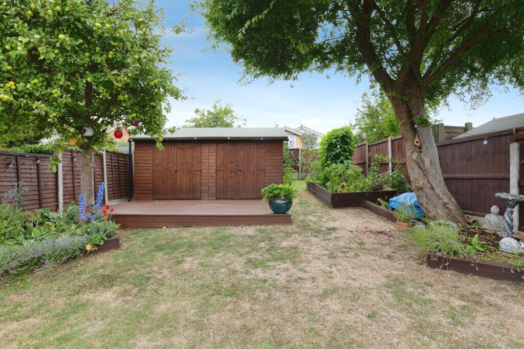 This is a well-presented 3-bedroom semi-detached bungalow in Wickford, Essex. The property features a modern kitchen and bathrooms, a good-sized garden with a shed and patio area. It is conveniently located near schools and transportation links.
