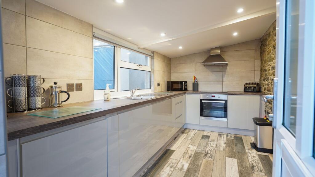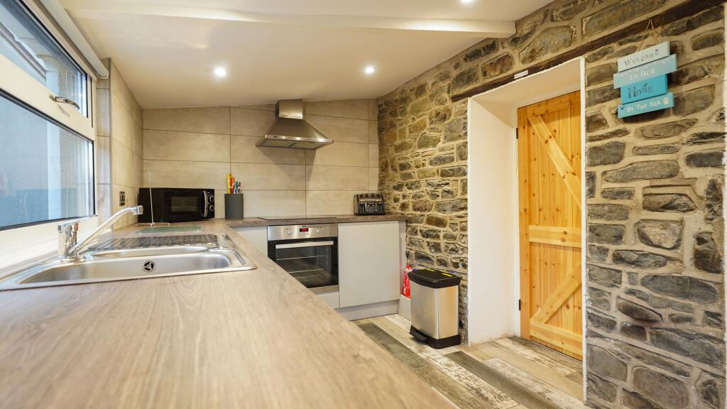 Based on the images, the property appears to be in good condition. The interior shows a recently renovated kitchen and bathroom, with modern fixtures and fittings. The living areas are presented well and appear clean and well-maintained. There is evidence of a wood-burning stove which could be a desirable feature. There is no visible evidence of significant repair or renovation needs. Therefore, a high condition score is justified.