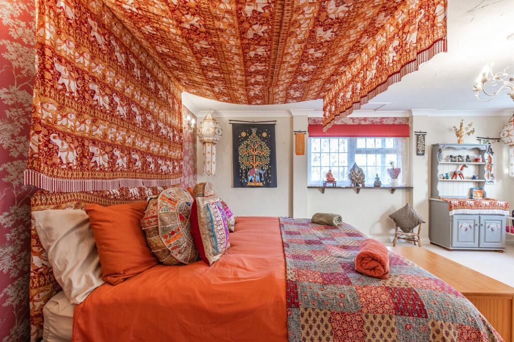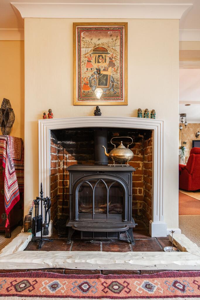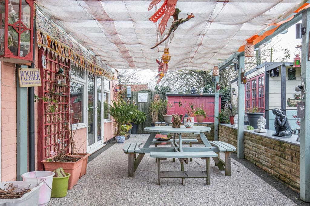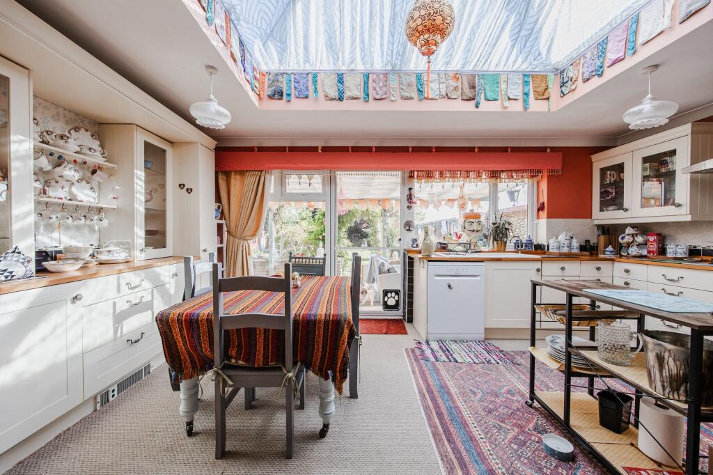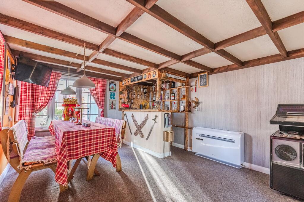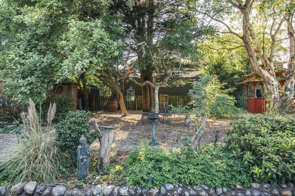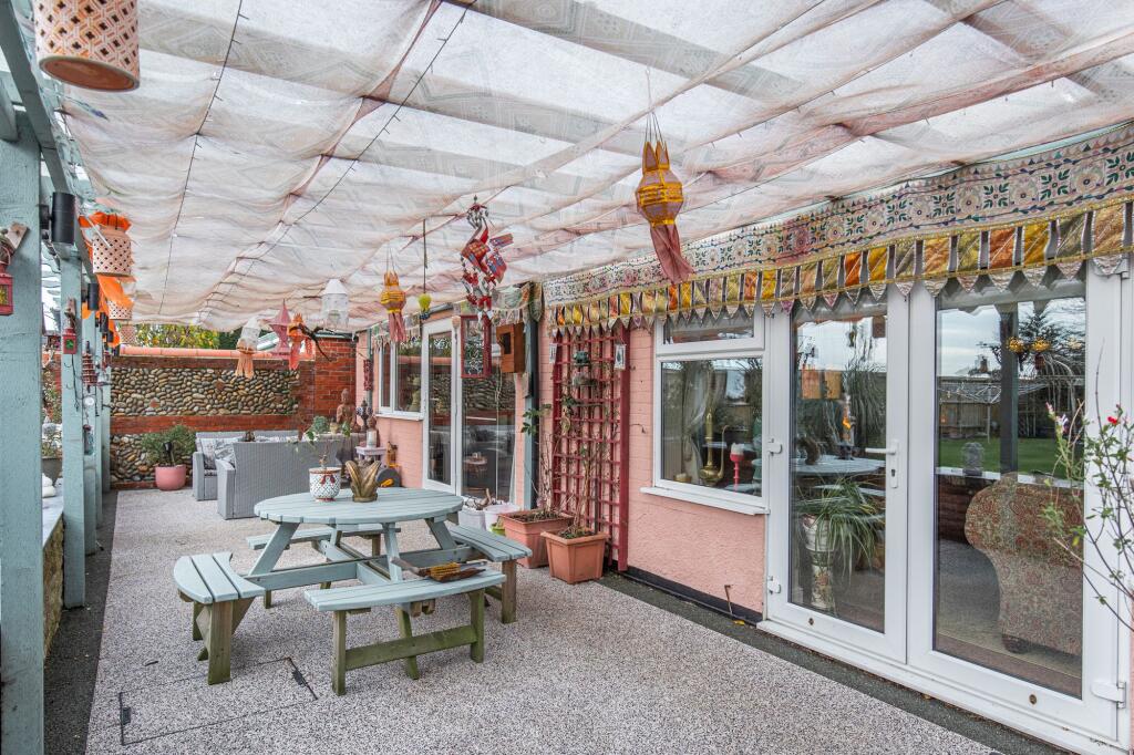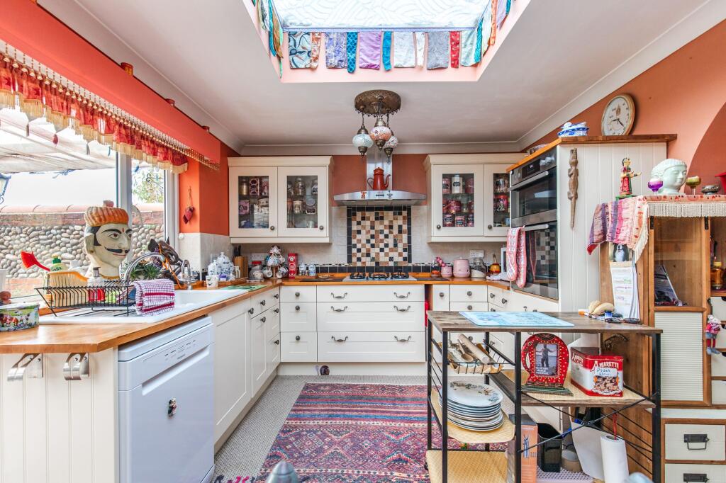 The internal presentation is eclectic; the décor incorporates various styles and elements, which may appeal to a niche buyer. The property benefits from a garden and potentially additional outdoor space which is largely not visible. The location presents a balance: the property offers a tranquil environment while still being within a reasonable distance to the amenities of nearby Sheringham, as well as good schooling.