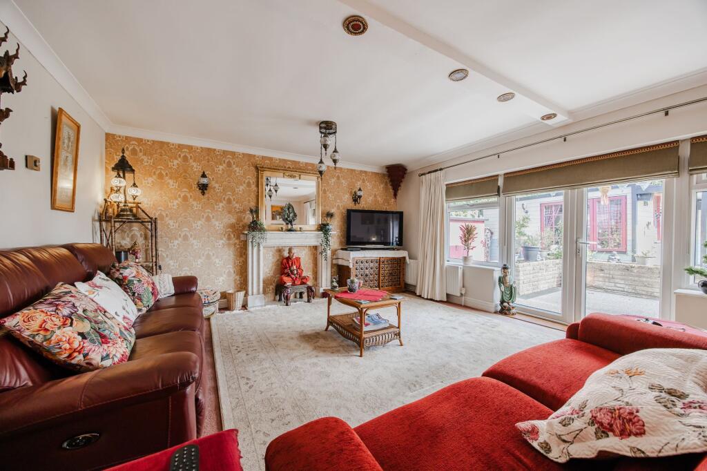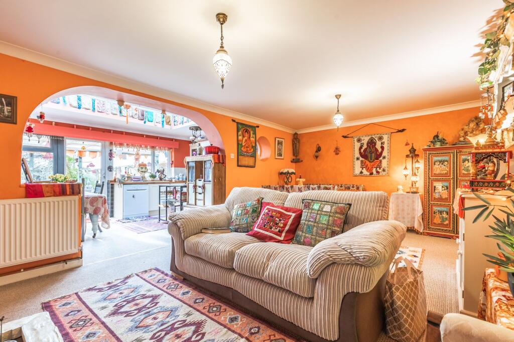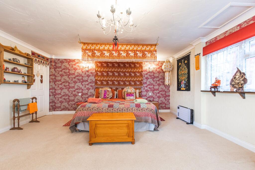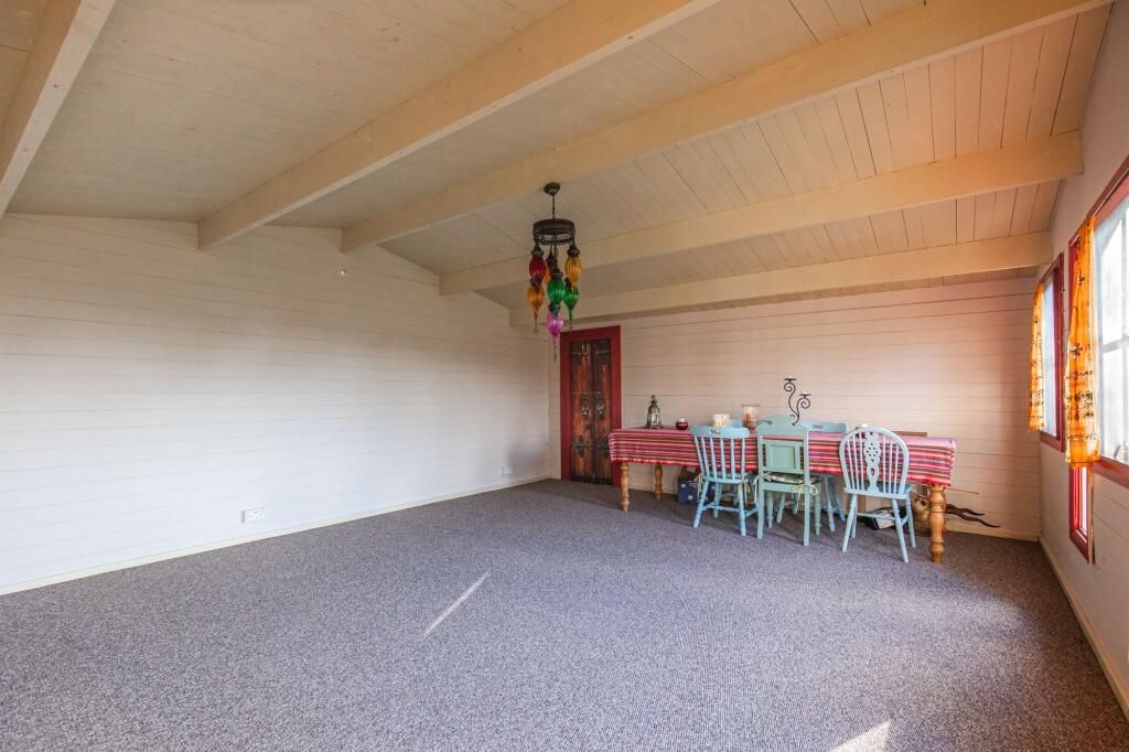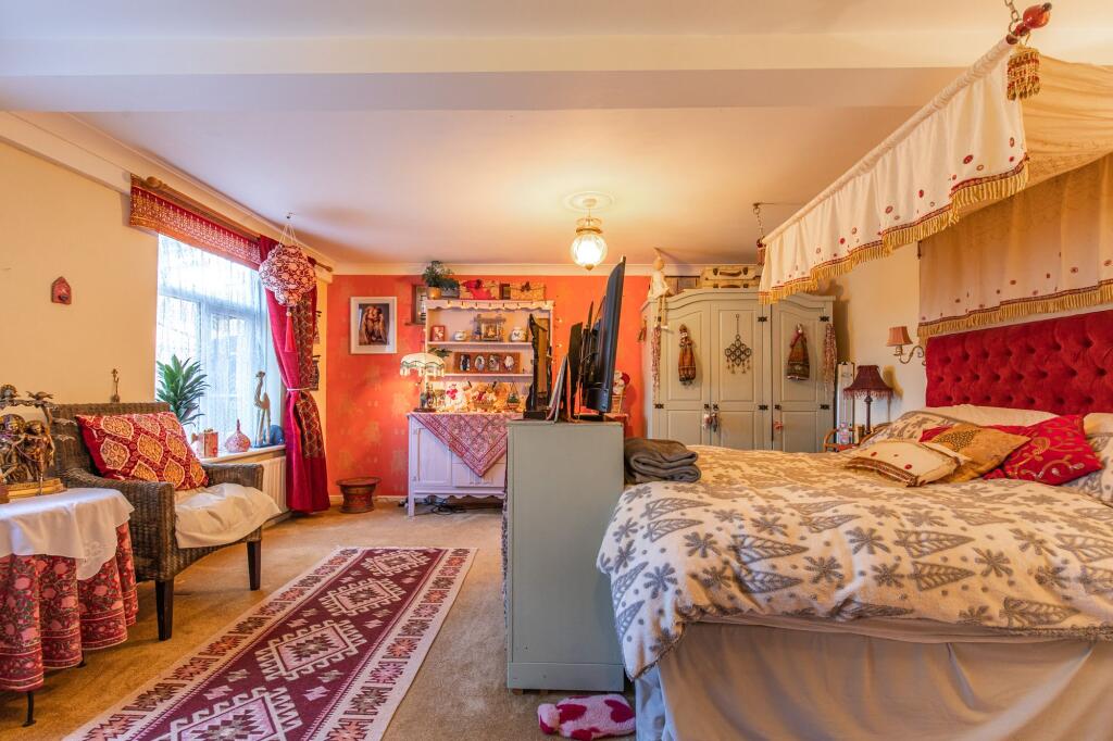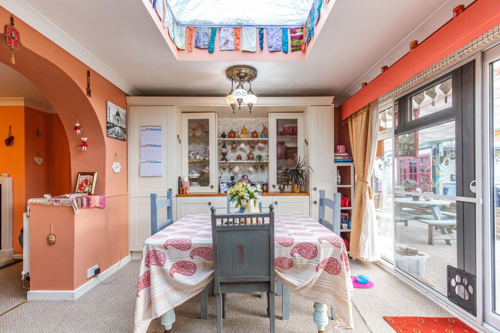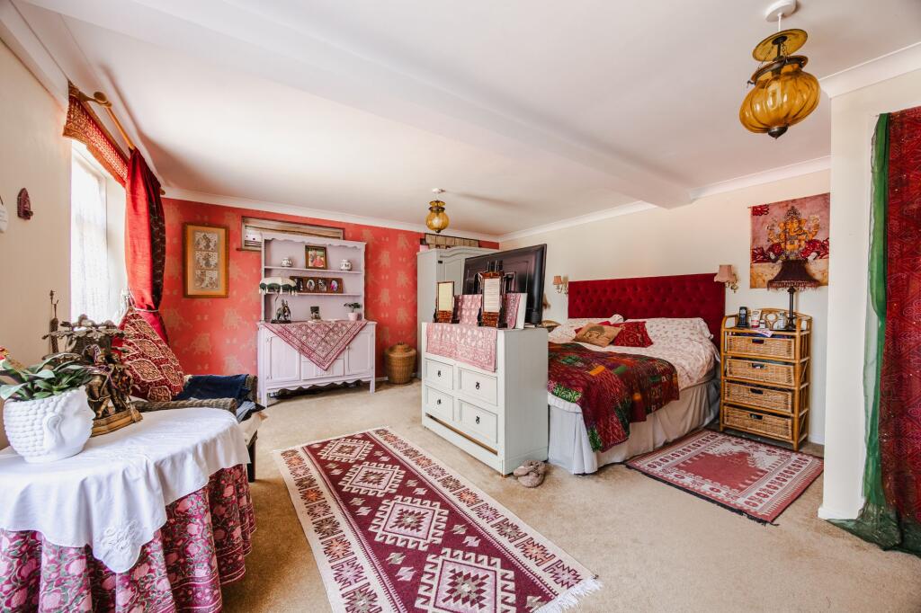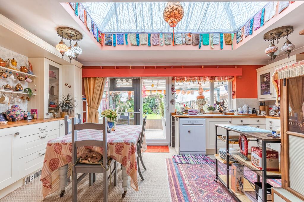 The internal presentation is eclectic; the décor incorporates various styles and elements, which may appeal to a niche buyer. The property benefits from a garden and potentially additional outdoor space which is largely not visible. The location presents a balance: the property offers a tranquil environment while still being within a reasonable distance to the amenities of nearby Sheringham, as well as good schooling.