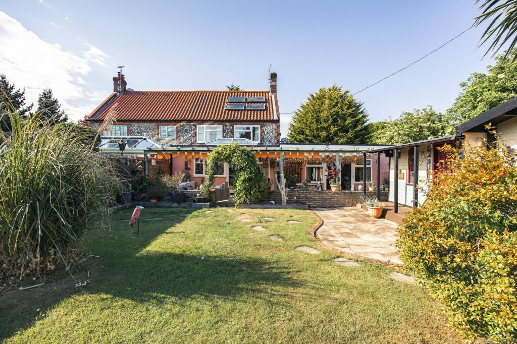 Meadow Cottage is a charming three-bed, two-bath semi with a self-contained annexe, stunning field views, and a prime location between Sheringham and Cromer. Includes a landscaped garden and outbuildings.