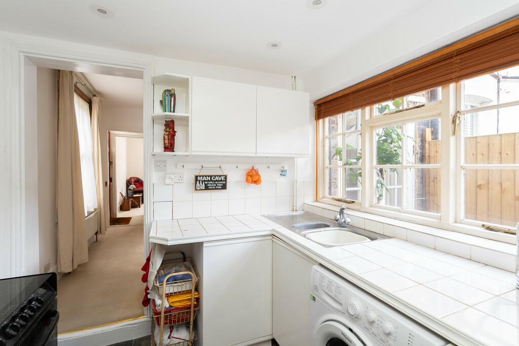 The property itself appears to be reasonably well-maintained, but some updates, particularly in the kitchen and bathroom, might enhance its modern appeal. The images reveal a functional layout with two bedrooms, two reception rooms, and a small courtyard garden, which offers some outdoor space. The overall square footage is not provided, which is an important aspect in determining value.