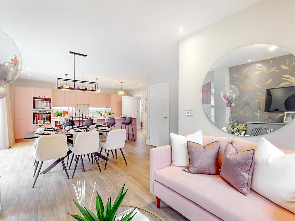 The jewel in the crown of this four-bedroom detached family home is a huge open-plan kitchen/dining room that incorporates a snug, an island, and bi-fold doors to the garden. There’s a separate living room, a utility room, three bathrooms, a dressing room to bedroom one, and a garage.