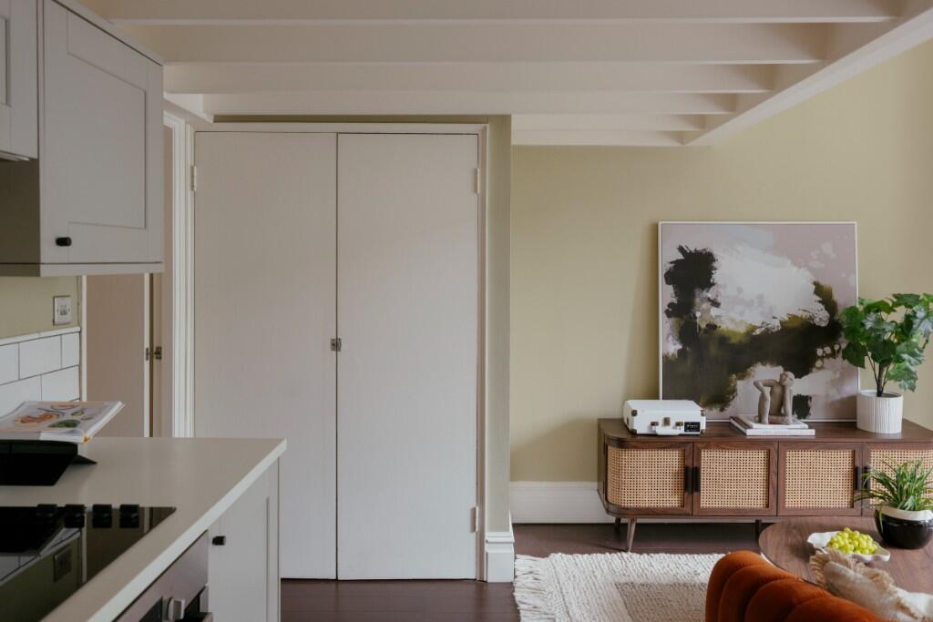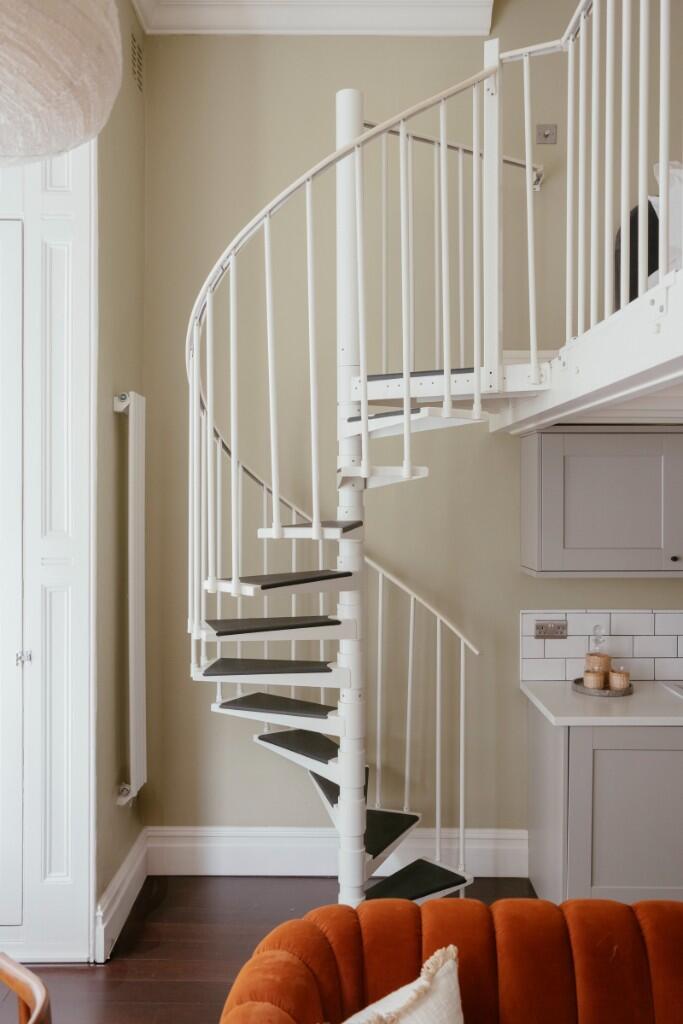 Positioned in a mansion block on a tree-lined street in Belsize Park, this one-bedroom mezzanine apartment is defined by its calming palette and inviting textures. Located on the first floor, it benefits from soaring ceilings that reach almost four metres in height.