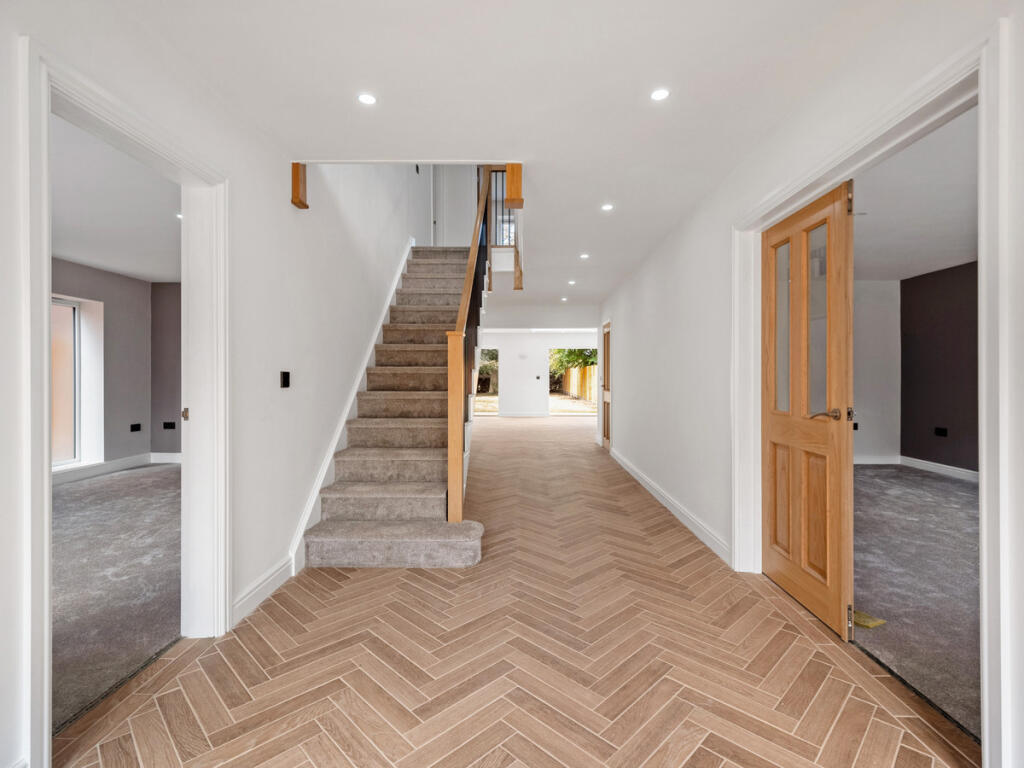 A detached property located in Thurlaston, Rugby, Warwickshire. The property has 5 bedrooms, 3 bathrooms and a large garden. The interior is modern and appears to have been recently renovated. The property is listed with Fine & Country.