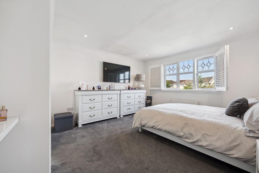 The property at Langlook Road, Crookston, Glasgow, G53 7NP is a detached house with 5 bedrooms and 3 bathrooms. The photographs show the property to be in good condition, with a modern kitchen and bathrooms. The property also benefits from a conservatory and a well-maintained garden with a shed. The property is located 1.44 KM from Crookston train station.