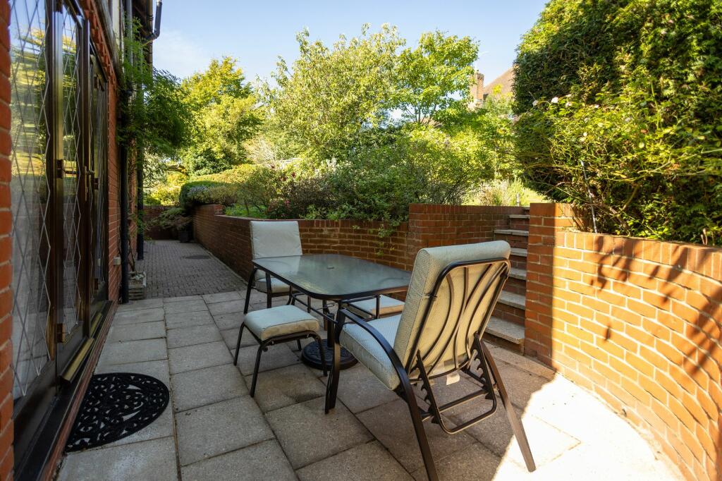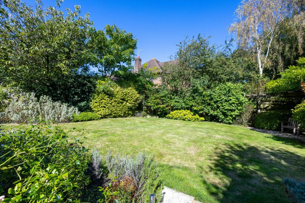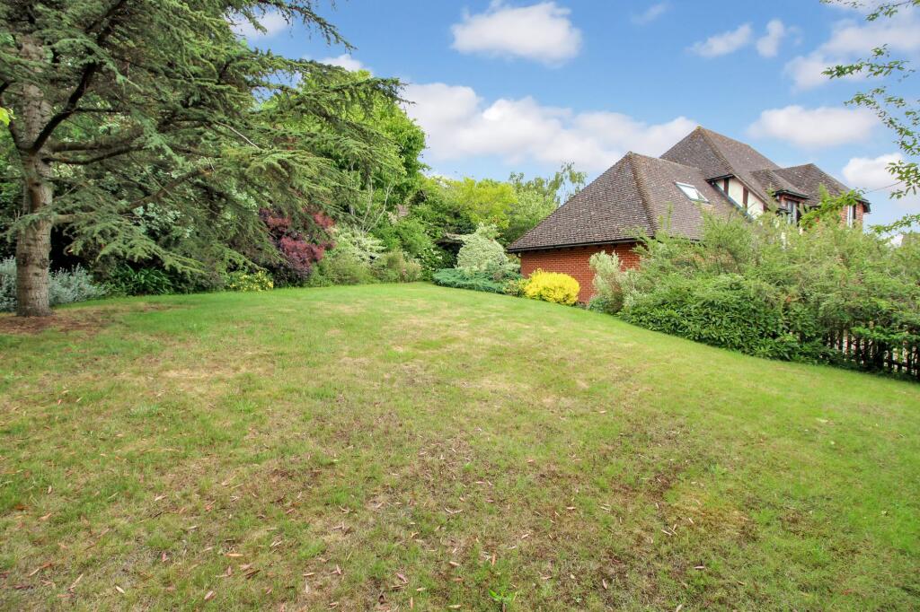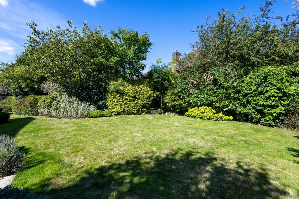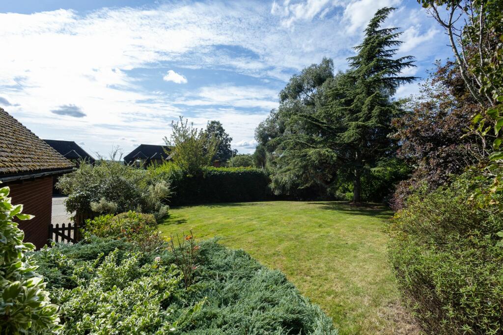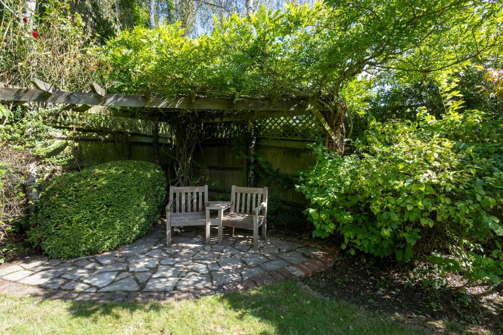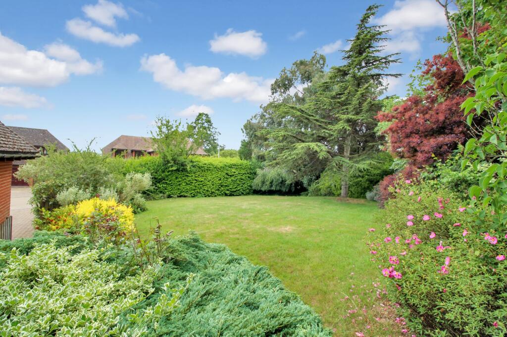The property includes a substantial garden, as shown in the aerial and ground-level photographs. The garden is well-maintained, with a variety of plants and trees. The presence of a patio area suggests potential for outdoor entertaining.