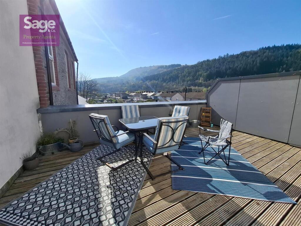This property is a 2 bedroom flat located on Gladstone Street in Crosskeys, Caerphilly. The flat is modern and well presented, with a newly fitted kitchen and bathroom. It benefits from a private decked roof terrace offering views of the surrounding area. The location is convenient, with a train station nearby and several primary schools within walking distance. The list price of £150,000 seems reasonable considering the average price per square foot in the area, however, the lack of plot size data makes a definitive statement on this difficult. The property appears to be in excellent condition.