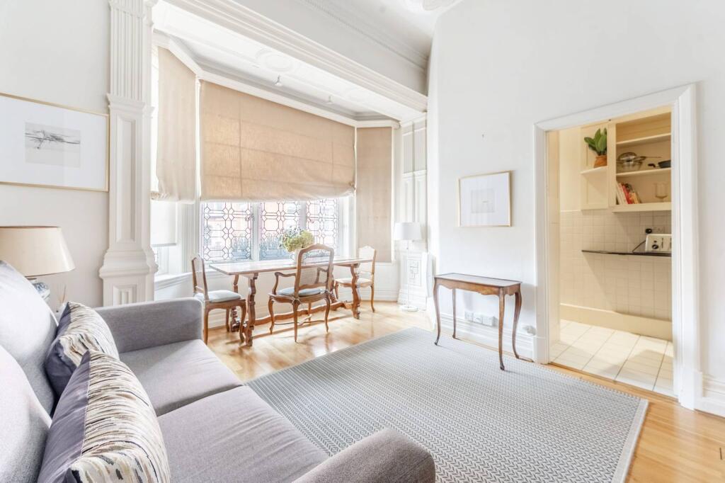 SHORT LET. Arranged on the raised ground floor, this charming studio apartment offers high ceilings and a spectacular leaded bay window. The apartment is ideally located for Brompton Road and Knightsbridge's exceptional shopping.