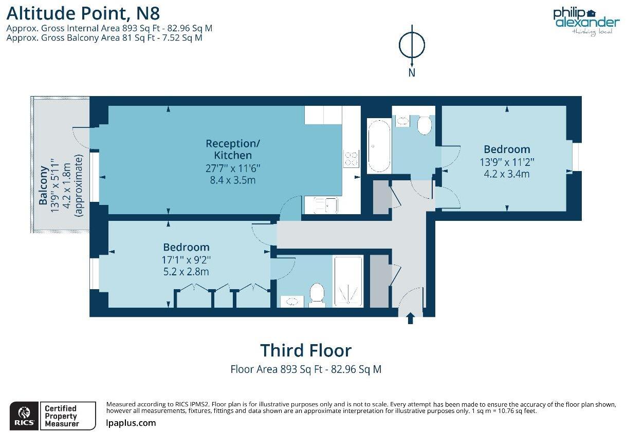 This property is a 2-bedroom flat located in Hornsey, London. The flat is situated in Altitude Point on Hampden Road, in the N8 postcode area. The location benefits from close proximity to transportation and schools. Based on the images, the flat appears to be in modern condition. The kitchen and bathrooms look recently updated and well-maintained. The living spaces are bright and airy, with a balcony offering outdoor space. Considering the modern condition and desirable location, the price seems reasonable.