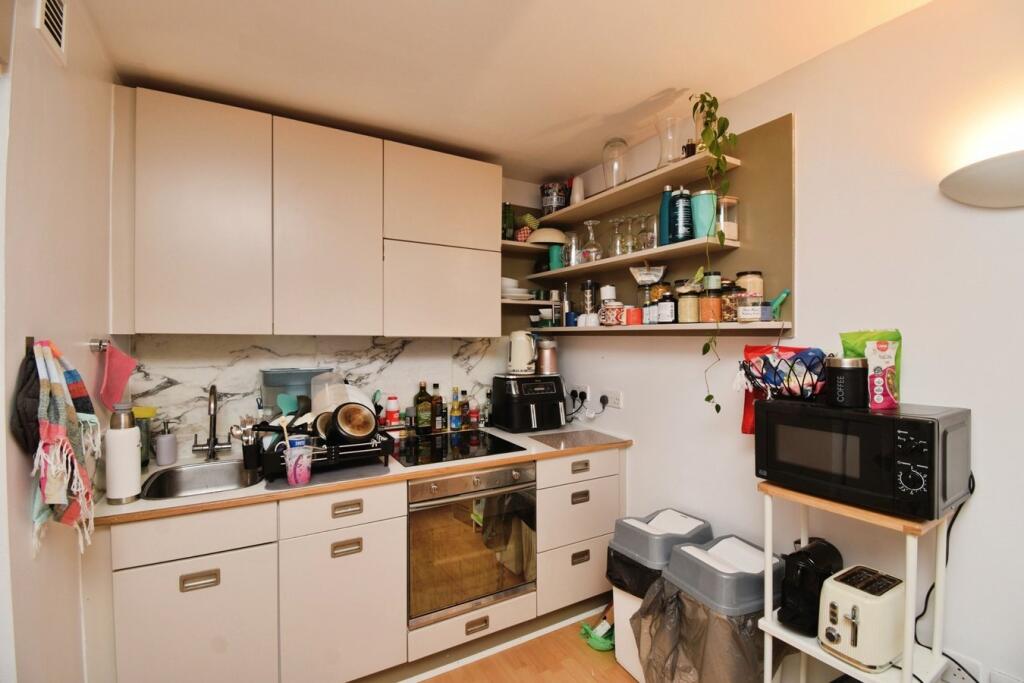 This is a one-bedroom apartment located in Deals Gateway, Brockley, Lewisham. The property is in a modern apartment block and appears to be in good condition. The apartment comprises a living room, kitchen, bedroom and bathroom. The property benefits from good transport links and is close to local schools. The property has a communal garden area. The asking price of £315,000 seems reasonable for the area and the type of property.