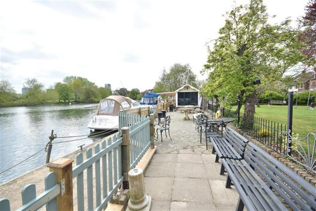 This property in Caversham, Reading presents a unique opportunity for buyers seeking a riverside leisure plot with exclusive access to the River Thames. The listing offers a private slipway, a cabin with basic amenities, and a generous outdoor space directly adjacent to the water. The photographs depict both the riverside terrace and what looks to be the grounds which are mainly lawned, with a patio and additional outdoor lavatories available.