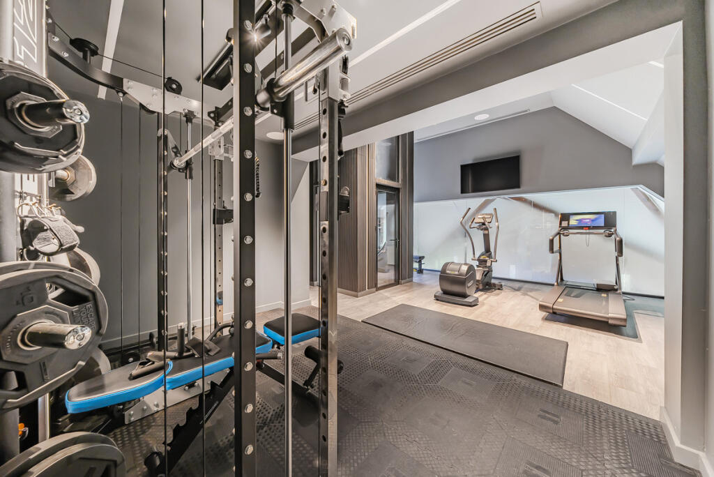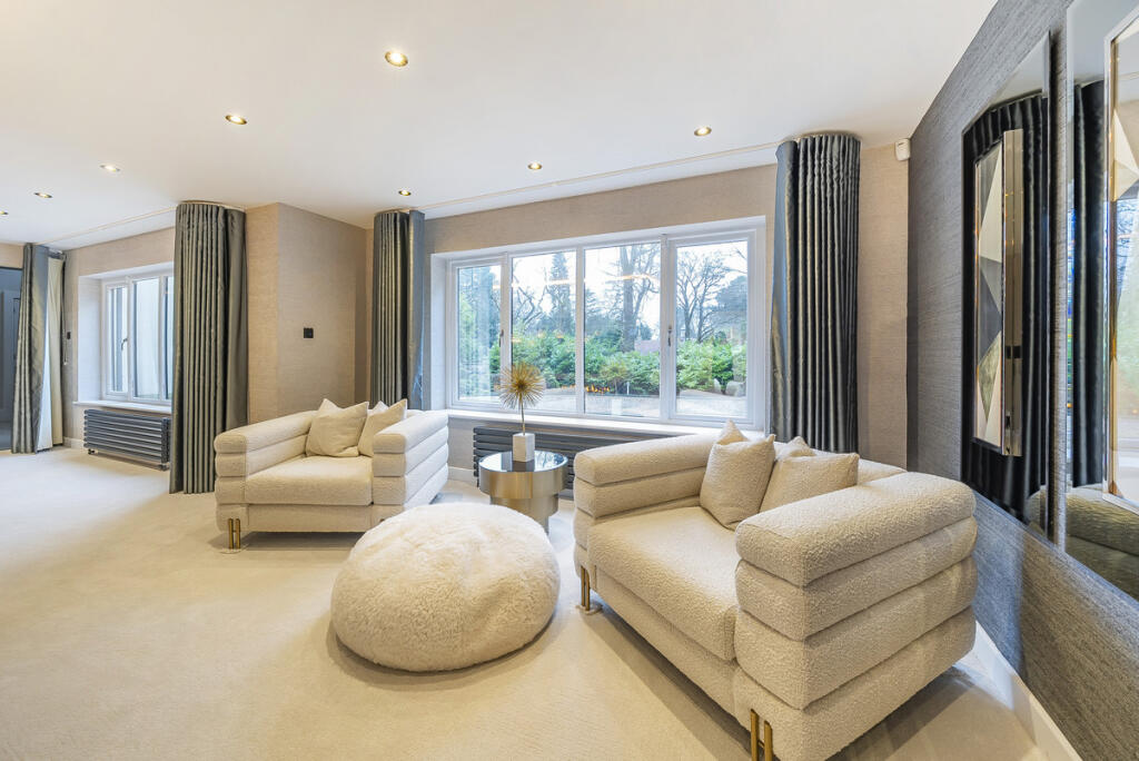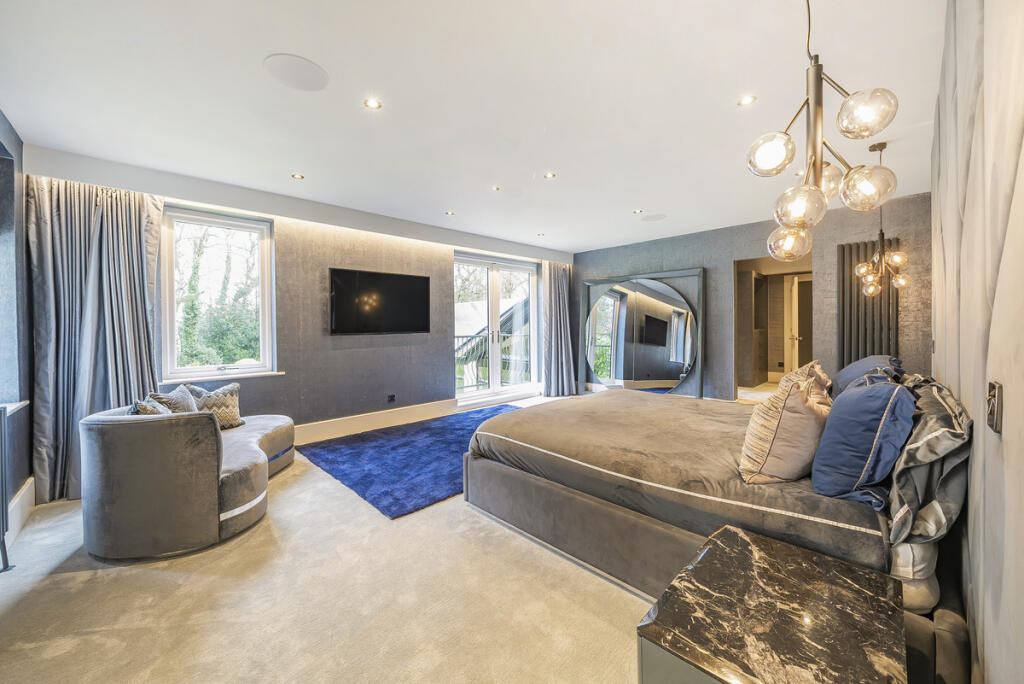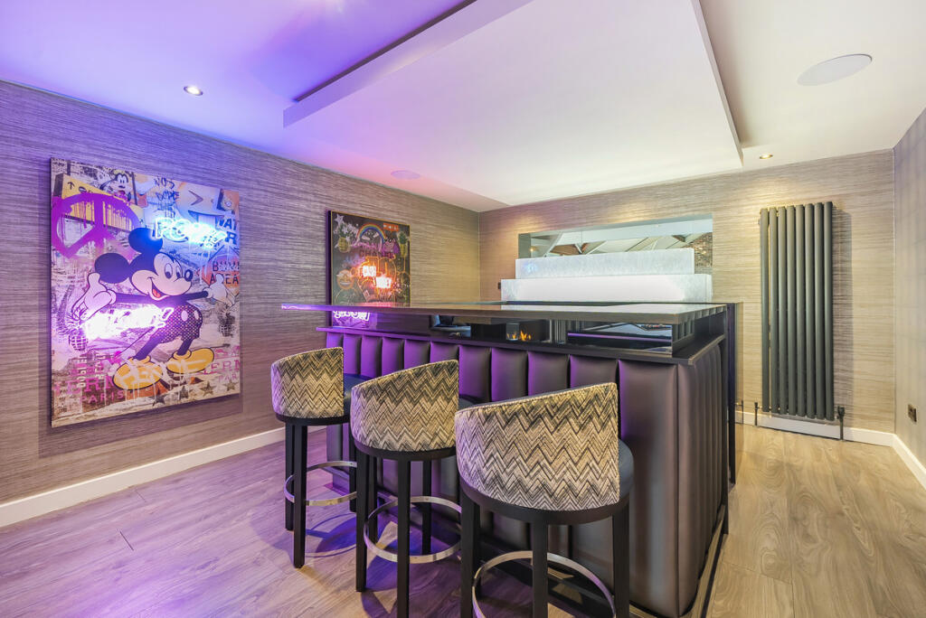 This property in Harewood, Leeds is a substantial seven-bedroom, eight-bathroom house, boasting a large footprint of 7,928 square feet. The exterior presents an impressive and modern design. Interior images reveal a luxurious finish, with modern features, high-quality materials, and a well-designed layout. The property includes numerous living areas, a sizeable kitchen, and notably, an indoor swimming pool, fitness facilities, and a home bar. These luxury features along with the high specification of the interior finish elevates the property above its peers.