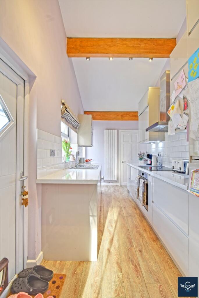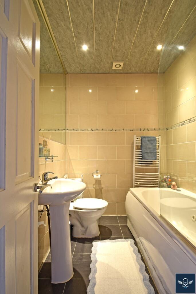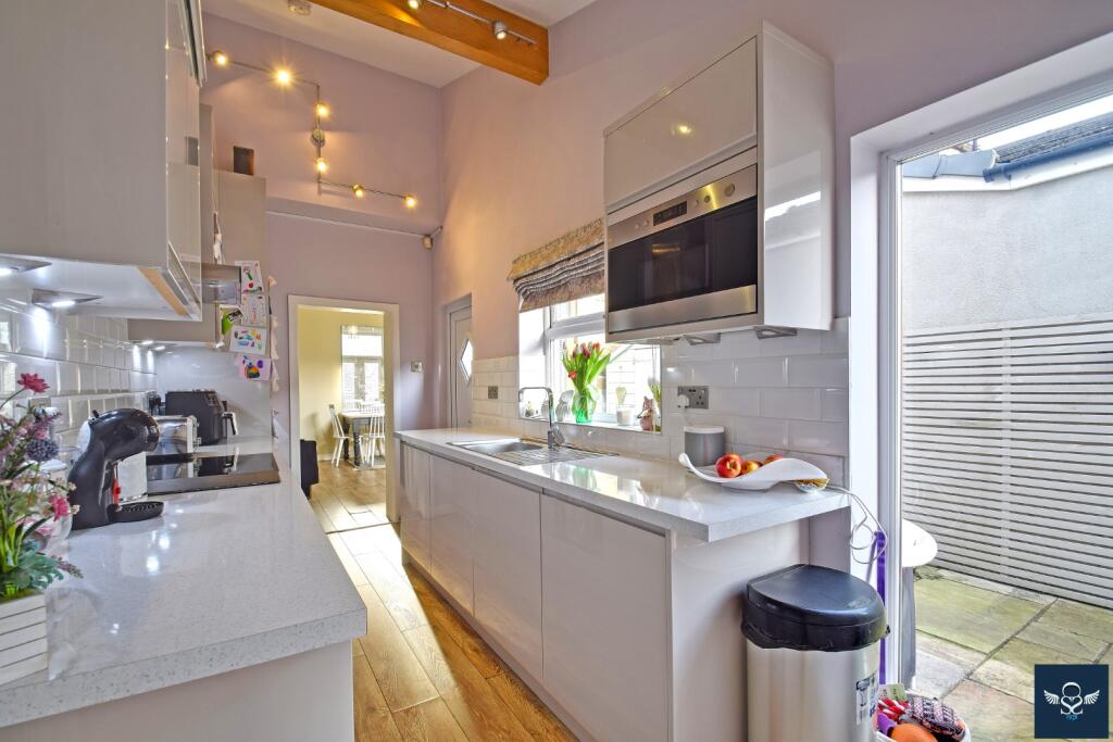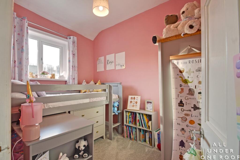 Based on the provided images, the property appears to be in good condition. It has undergone some modernisation, with a recently updated kitchen and bathrooms. The property seems well-maintained and presented, suggesting a high standard of finish. There is no visible evidence of significant repairs or renovations required. The garden also appears to be well-maintained, with a decked area and artificial turf.
