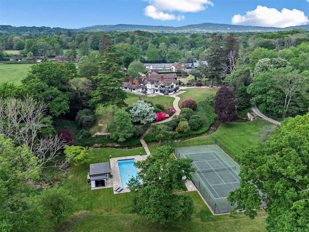 Set in stunning grounds and surrounded by beautiful rolling Surrey countryside, a magnificent country house offering more than 7,000 sq ft of attractive accommodation, plus swimming pool and tennis court, in all just over 10 acres