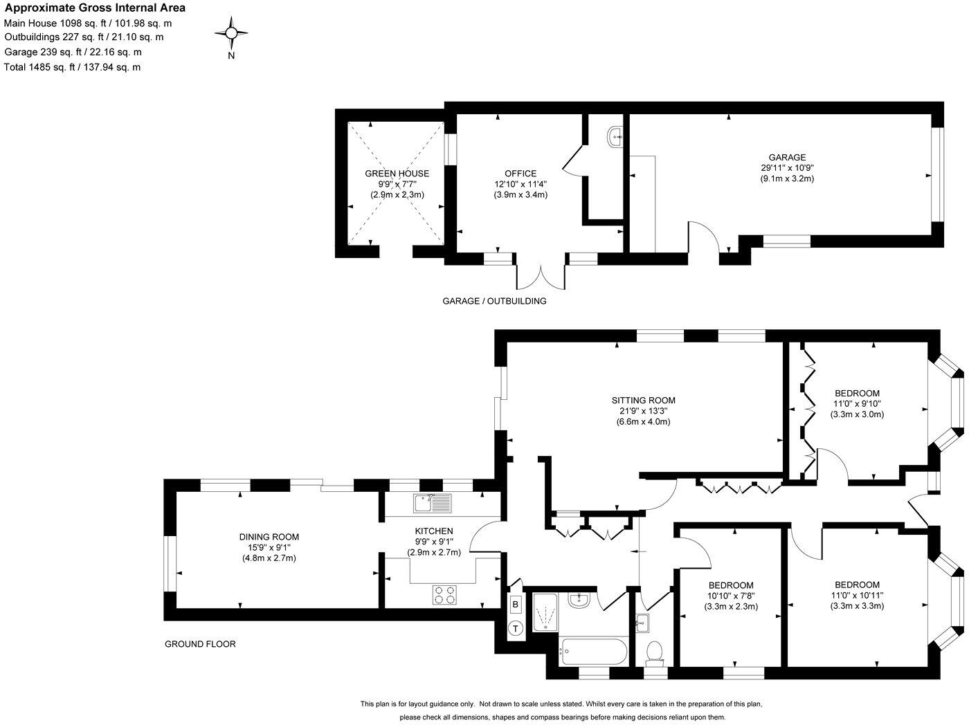 This is a detached bungalow located on Birch Lane, West End, Woking, Surrey. The property features three bedrooms and one bathroom. It has a square footage of 1,522.66 sqft. The property includes a well-maintained garden with a patio and a greenhouse. The house appears to be in good condition, with modern updates in the bathroom and kitchen. The location is convenient, with proximity to schools and transportation. The listing price is £675,000, which is in line with the average property prices in the area.