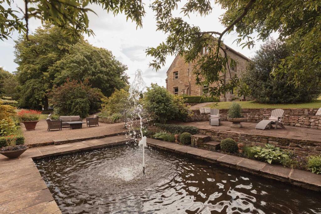The property is set within a large plot with beautifully landscaped gardens. The property includes a pond and a patio.