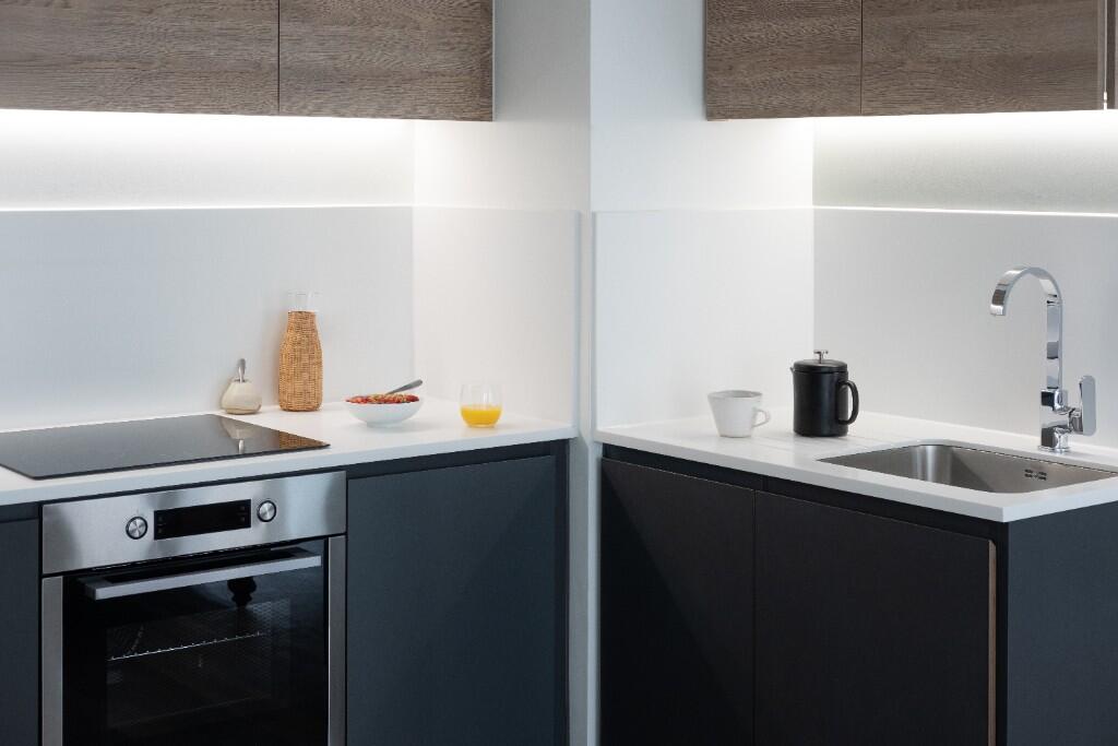 This stunning 1-bed studio apartment consisting of great living space, boasts floor-to-ceiling windows throughout, a stylish tiled bathroom, an open-plan fully fitted kitchen including Montpelier appliances and an induction hob. Being fully furnished, the bedroom accommodates a king-sized bed