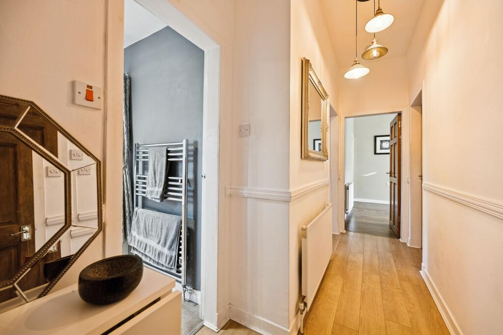 This is a two-bedroom flat in Cardonald, Glasgow. The property appears to be in generally good condition internally, with a modern kitchen and pleasant living spaces. The property benefits from a garden with a shed. The location offers good transport links and local amenities. The price appears reasonable compared to the average price per square foot in the area. While the interior is modern, the exterior could benefit from cosmetic improvements.