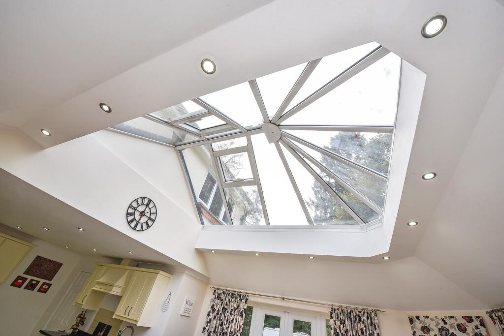 The accommodation is presented over two floors and appears to be well-maintained. The kitchen, which is a key selling point, has undergone renovations, giving it a modern look. The addition of a conservatory adds to the living space, creating a bright and airy atmosphere. However, some parts of the property show minor signs of aging. Several bedrooms and bathrooms look to be well-maintained, but other parts of the interior could benefit from updating to create a wholly modern feel. The inclusion of fireplaces adds a sense of character and warmth, while the large windows in multiple rooms maximize natural light.