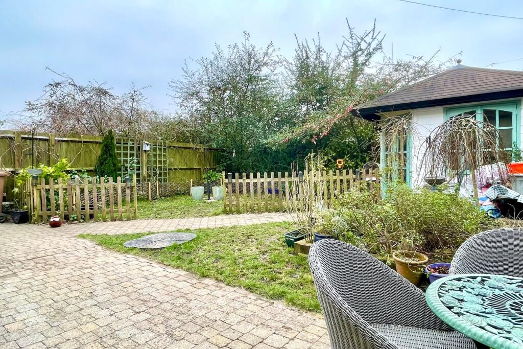 The property includes a garden, as shown in the provided images. The garden appears to be of a reasonable size for the property, with a paved patio area and a separate garden shed.