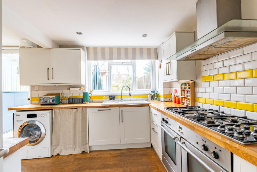 The property appears to be in good condition, with a recently updated kitchen and bathroom. The images show a modern and well-maintained interior. The garden is of a good size for an end of terrace property and includes a patio area and a garden shed, which could be used as a home office or studio.