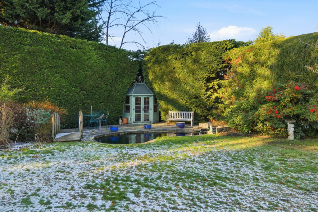 No chain. Substantial 1954 five-bed home in prestigious Weybridge Park Private Estate. 3,800 sq ft across 3 floors, 5 en-suites, 2 receptions, open-plan kitchen. Mature gardens with koi pond, double garage. Walk to High Street, schools & station