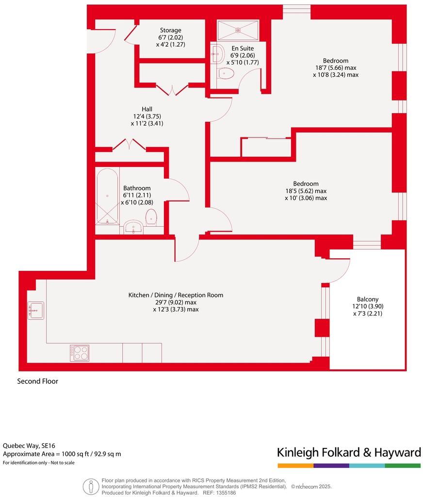 This is a modern two-bedroom, two-bathroom flat in Surrey Docks, London. The property is in good condition and benefits from a balcony and access to communal green space. The location is convenient for transportation and schools. The price is slightly above the average for the area, but this may be justified by the condition and features of the property.