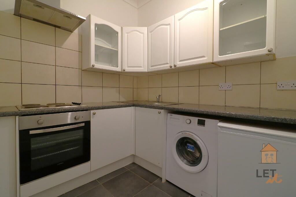 ONE BEDROOM flat presented UNFURNSIHED with white goods. Located on the first floor of a traditional sandstone tenement, this flat is presented in neutral tones of freshly painted white. Accommodation comprises spacious corner aspect lounge with dining alcove, fitted kitchen complete with hob, oven,