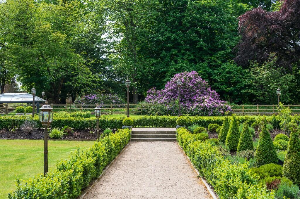Land: The property boasts extensive and beautifully landscaped grounds, including manicured lawns, formal gardens, and mature trees. Equestrian facilities, such as stables and paddocks, are also present, making it an ideal estate for horse enthusiasts.