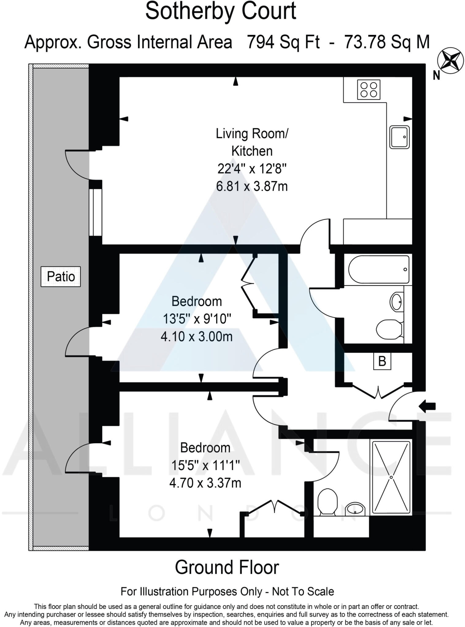 Spacious two-bedroom, two-bathroom ground floor apartment in Sotherby Court, Stewardsone Road, directly opposite Victoria Park. The property features a modern kitchen, bright living space, and one bedroom with an en-suite. Available for £2,900 PCM.
