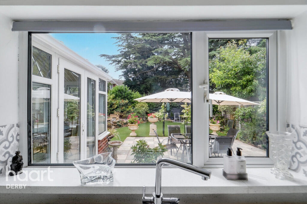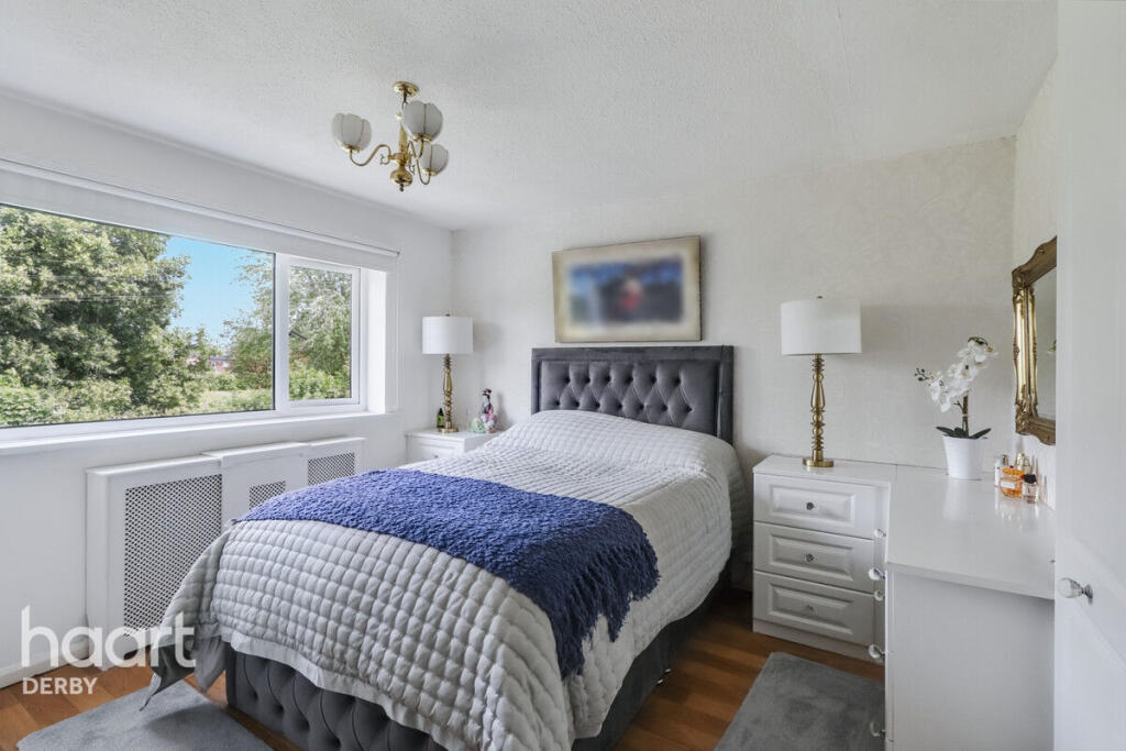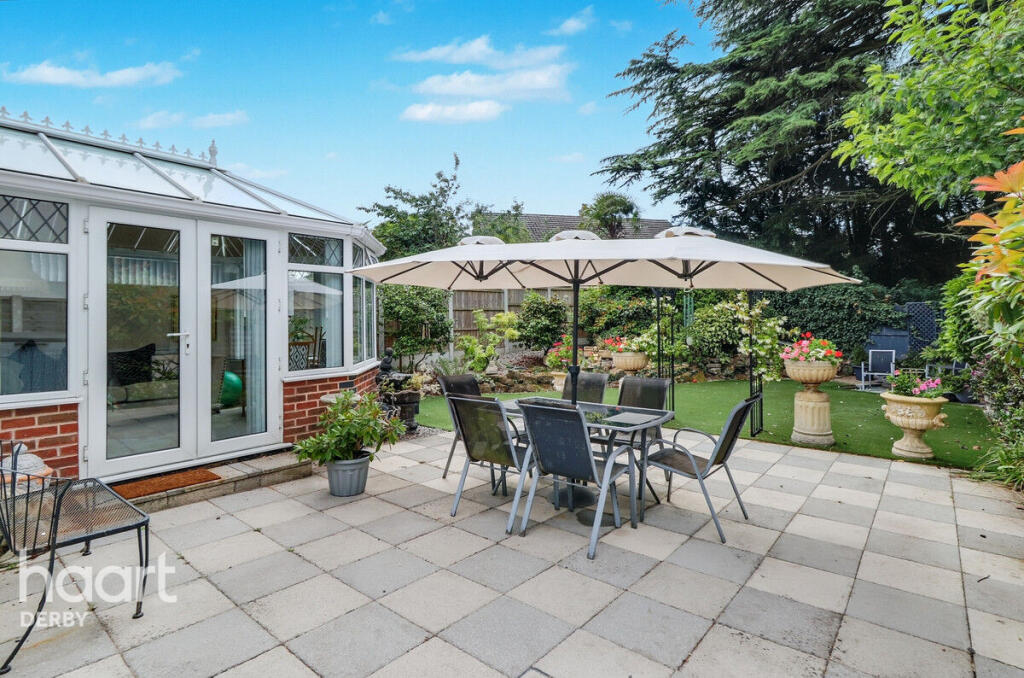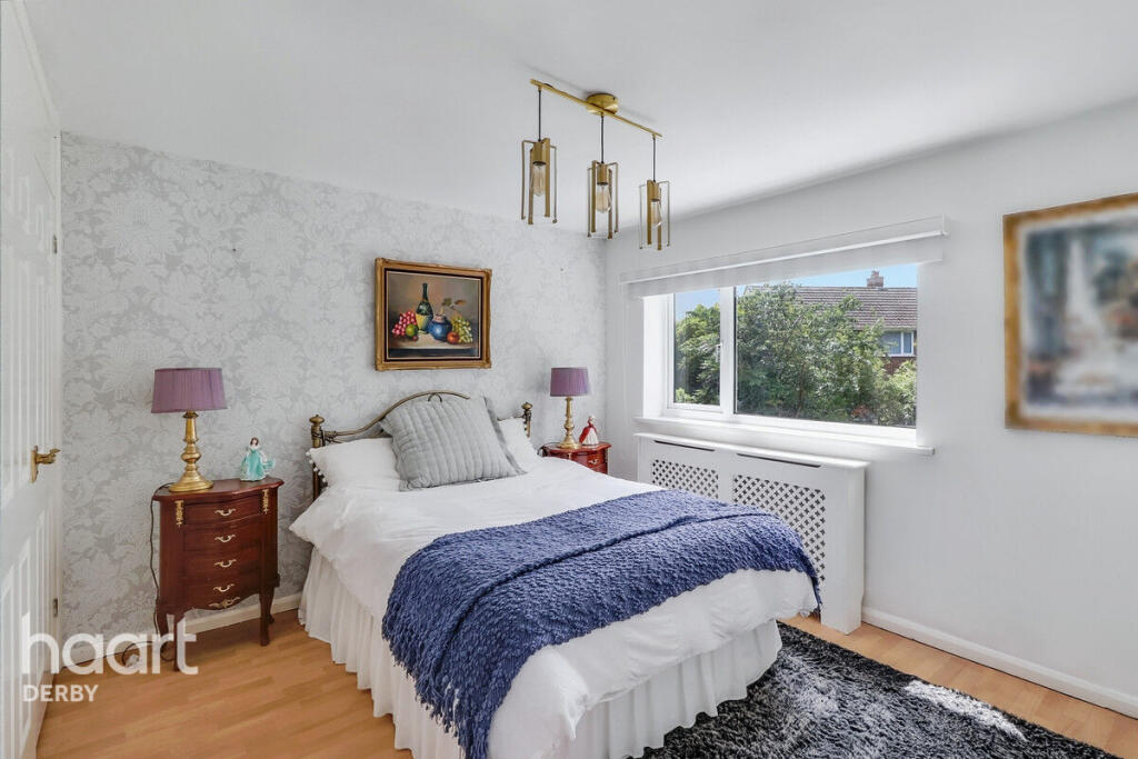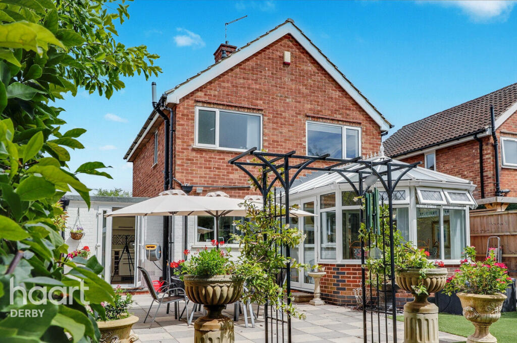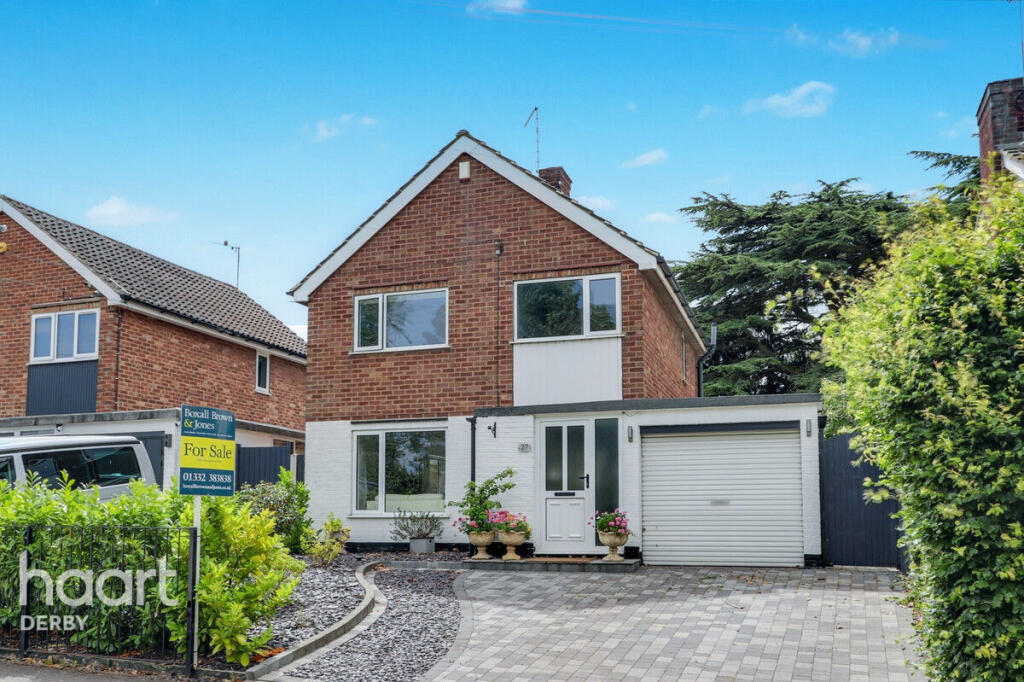 Beautifully presented three-bedroom home in a quiet Chellaston cul-de-sac. Features spacious lounge/diner, conservatory, two double bedrooms, private south-facing garden, garage, and double driveway. Ideally located with views over open green space