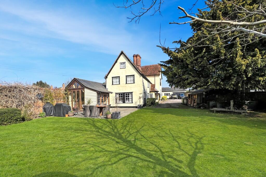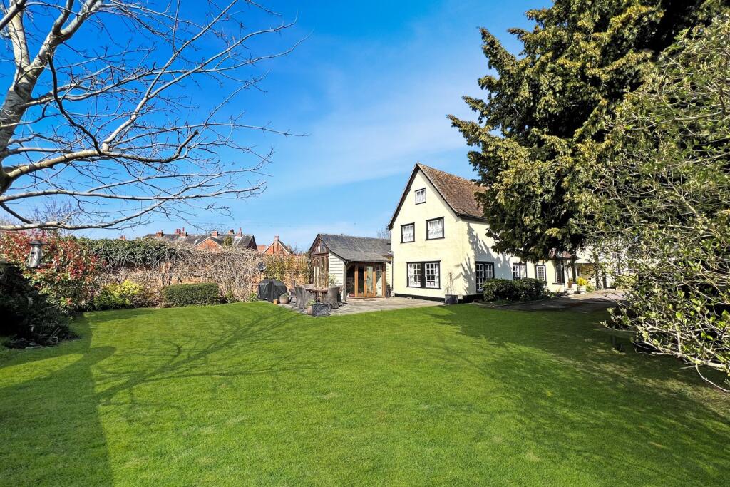 The property is a 6 bedroom, 5 bathroom detached house located on Head Street, Halstead, Essex. The property is a period property, with exposed beams and traditional features throughout. It appears to be well-maintained and in good condition. The images show a large garden, suggesting ample land. Given the average house price in the area is £369,391 and the average price per sqft is £309, the list price of £1,400,000 is significantly higher. However, this property is substantially larger and more luxurious than the average property in the area, and its period features and excellent condition justify a premium price. The nearby comparable properties support this, with one detached house on Head Street listed at £885,000. While there is a lack of sqft data to perform a precise comparison, the significant difference in price between the subject property and the average property in the area, coupled with the apparent size and quality of the subject property, suggests that while the list price is high, it is not unreasonable given the market conditions and the unique characteristics of this house. The property also benefits from a large garden. The location in Halstead appears to be good, with several schools within walking distance, including The Ramsey Academy, which has a good Ofsted rating. More information on local amenities and transportation links would be needed to provide a complete assessment of the location score.