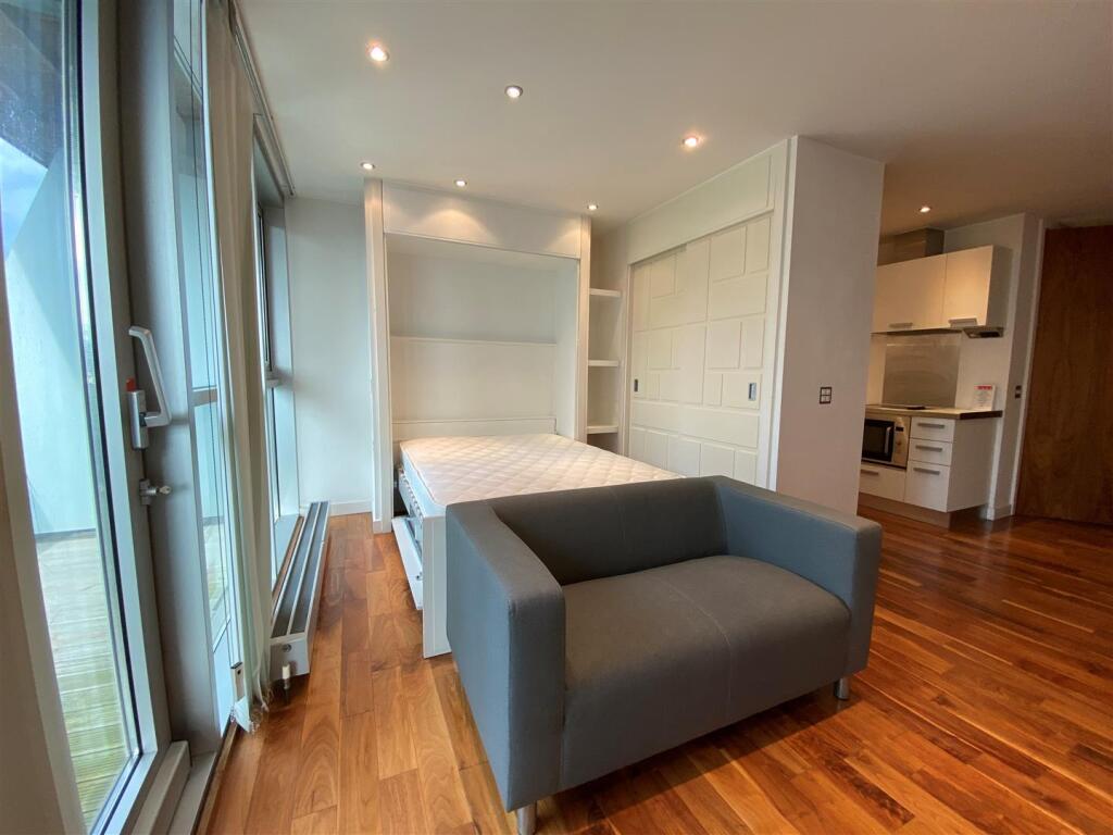 Available Mid November. This stunning STUDIO apartment, furnished to a high standard throughout and features maple floors throughout. Open plan living space with dining area, stylish fitted kitchen including fridge, microwave oven and hob. Fold away double bed and fitted wardrobes. Storage cupboa...