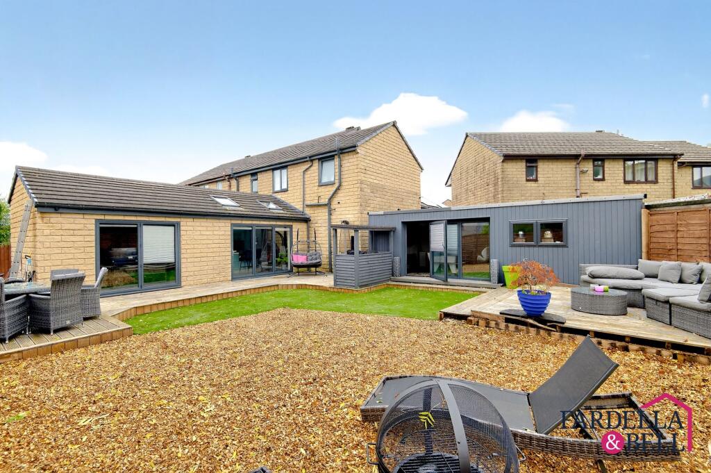 This is a well-presented four-bedroom semi-detached property in Colne, Lancashire. The house benefits from a modern interior, a good-sized garden with an outbuilding converted into a bar, and proximity to local schools and transportation links. The property features two bathrooms, a modern kitchen, and a utility room. The outdoor space is well-maintained and includes a decked area and seating. The property is conveniently located near Colne train station and several schools. The house is ideal for families looking for a comfortable and modern home with good access to local amenities.