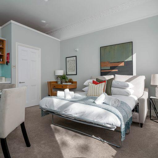 These spacious one bedroom apartments offer an open plan living area with kitchenette, separate bedroom and shower room with WC.