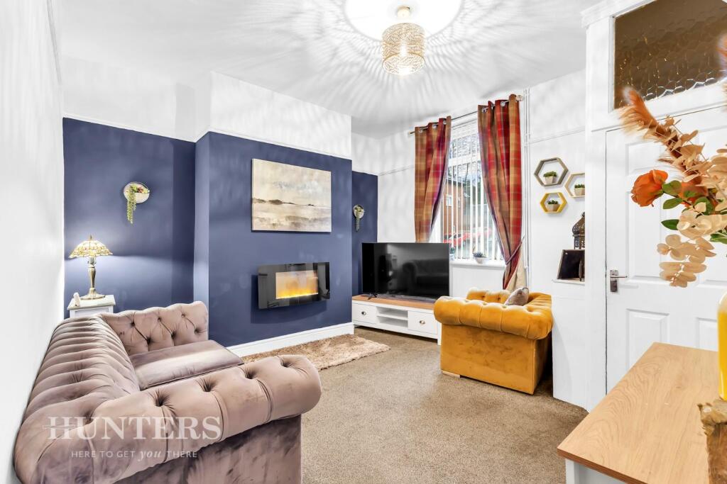 This is a two-bedroom terraced house located on Huddersfield Road in Oldham. The property is in a convenient location with access to schools and transportation. The interior is generally well-maintained, although the kitchen could use updating. The property benefits from a rear garden that requires some maintenance. Priced at £135,000, it appears to be reasonably priced for the area and property type. The property is marketed by Hunters.