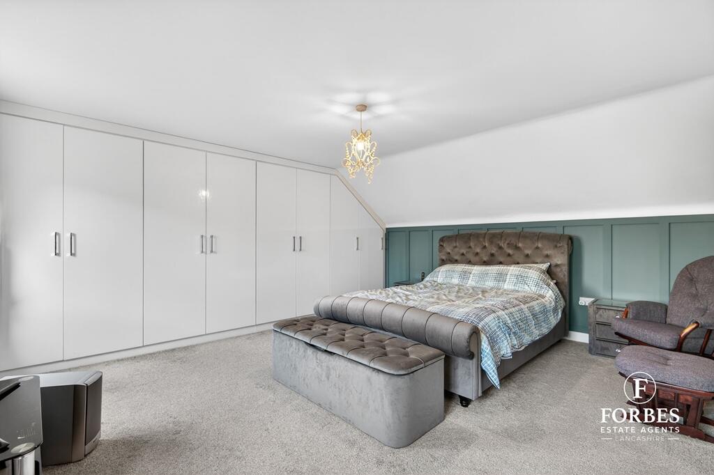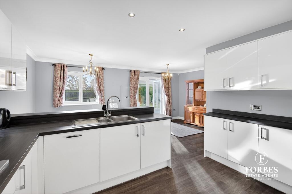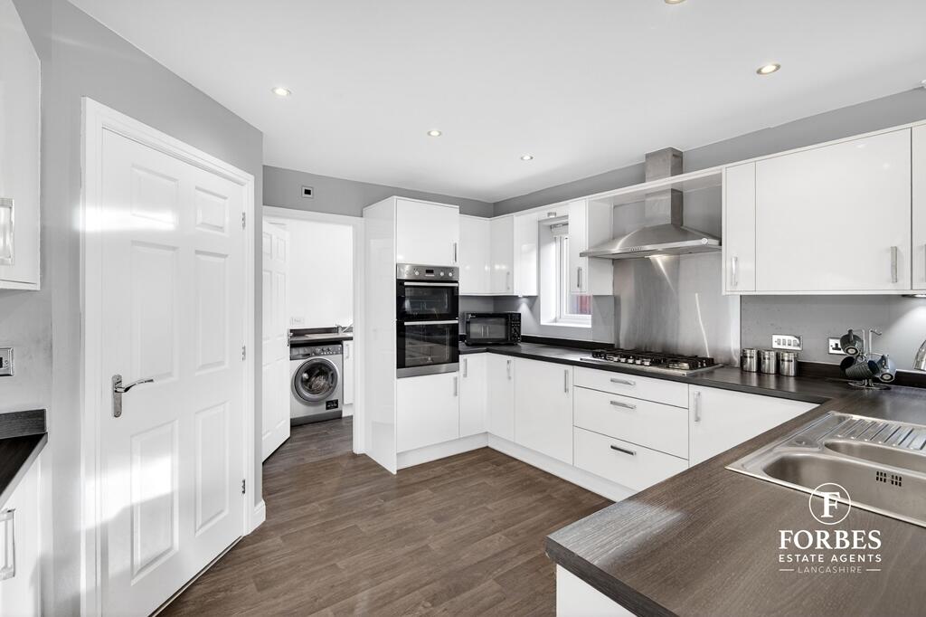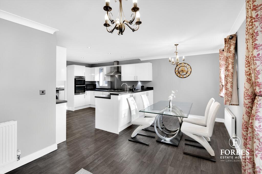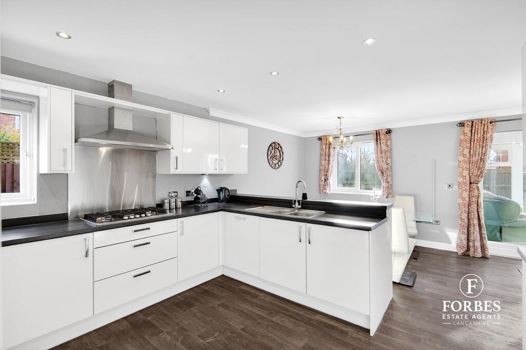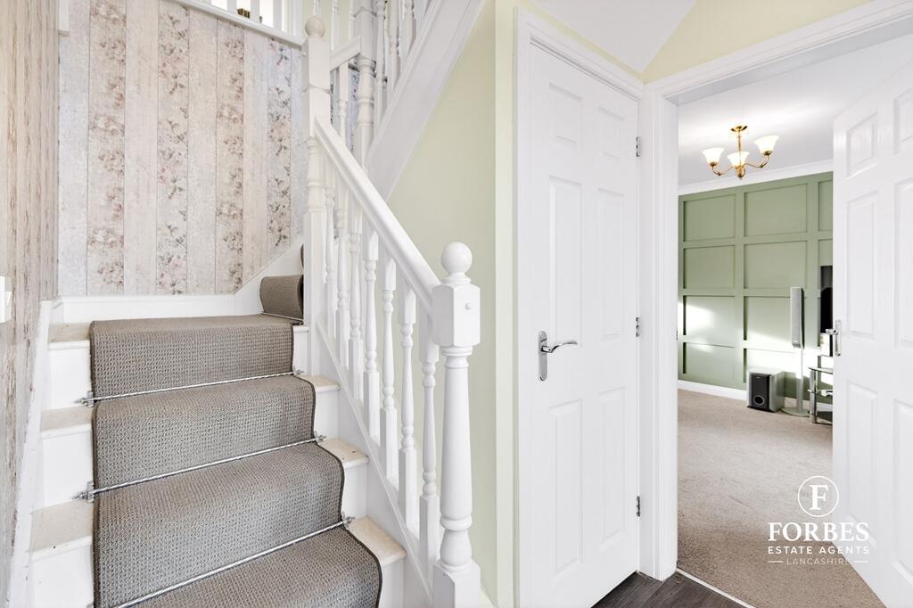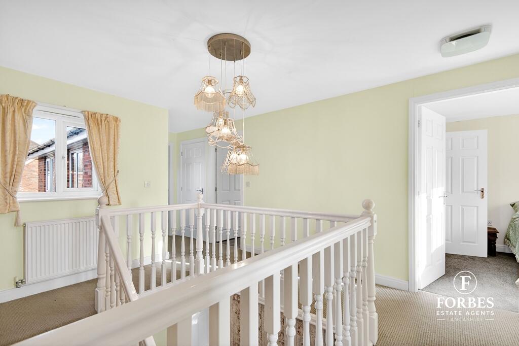 This is a detached property in Farington Moss, Leyland, featuring five bedrooms and four bathrooms. The house appears to be in good condition, with a modern kitchen and well-maintained interiors. It also benefits from a garden. The property is located in a residential area with access to nearby schools and transportation. The asking price is slightly above the local average but seems justified given the property’s size and condition.