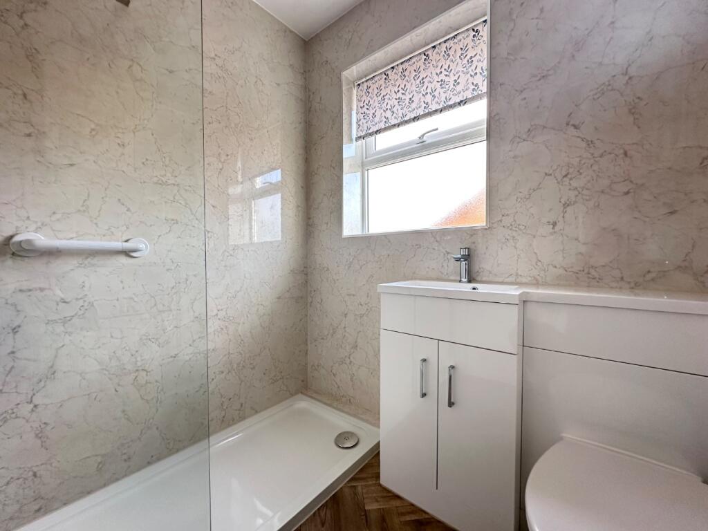 Semi-detached bungalow boasts spacious lounge, modern shower room, lovely garden with vegetable patch, garage, and potential for expansion.