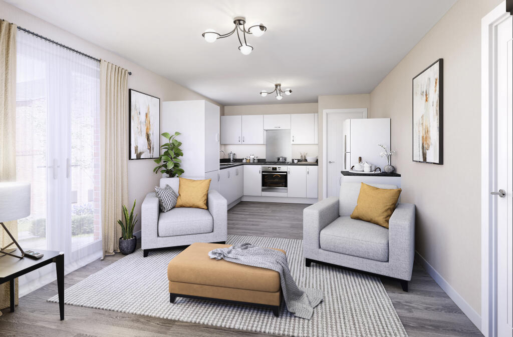Modern 1 bedroom FIRST FLOOR FLAT in Kings Moat Garden Village, Chester. Sleek OPEN-PLAN LIVING, MODERN KITCHEN, and LANDSCAPED SURROUNDINGS. Available at £102,500 for a 50% share, offering stylish comfort and community living.