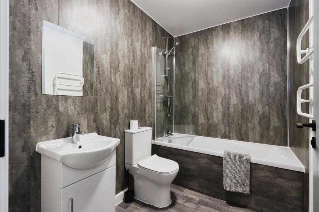 This one bedroom first floor apartment features a carpeted entrance hall, open-plan living area with kitchen diner, and built-in appliances. It has a rear-facing bedroom with carpet and a bathroom with shower over bath, toilet, sink, and vinyl flooring.