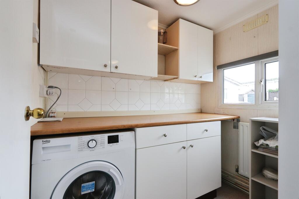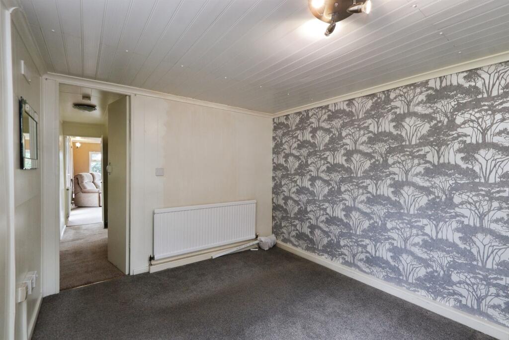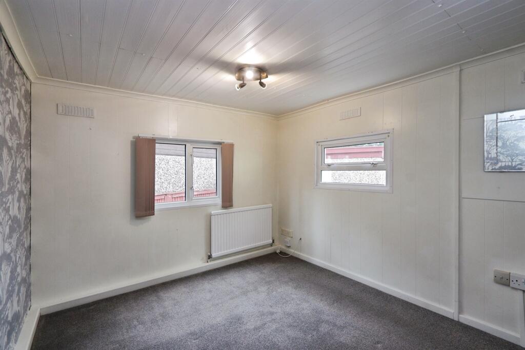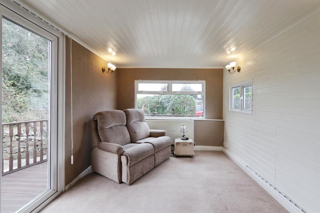 A well-kept home featuring a carpeted lounge with patio doors to front decking, a side-facing dining room, and a kitchen with wooden cupboards and front window. Includes a utility room, bright bedroom, tiled bathroom with walk-in shower, and a low-maintenance garden with patio.