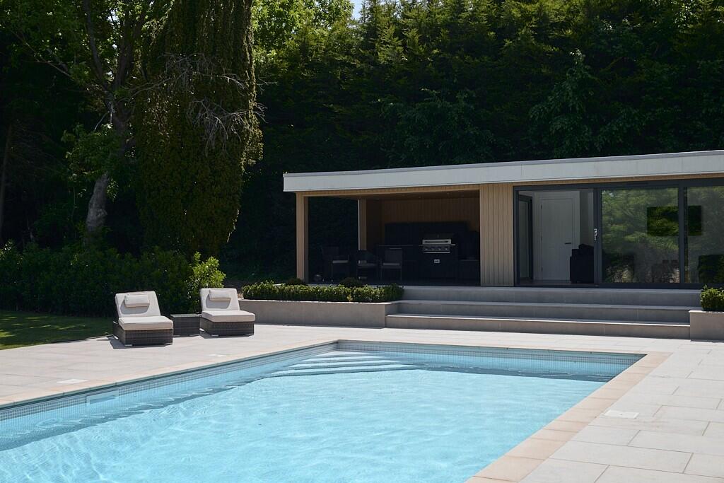 The property includes substantial grounds, featuring a swimming pool, extensive gardens, and a large paved area for outdoor entertaining. The size of the plot is not specified, but the images suggest a significant amount of land, providing privacy and space.