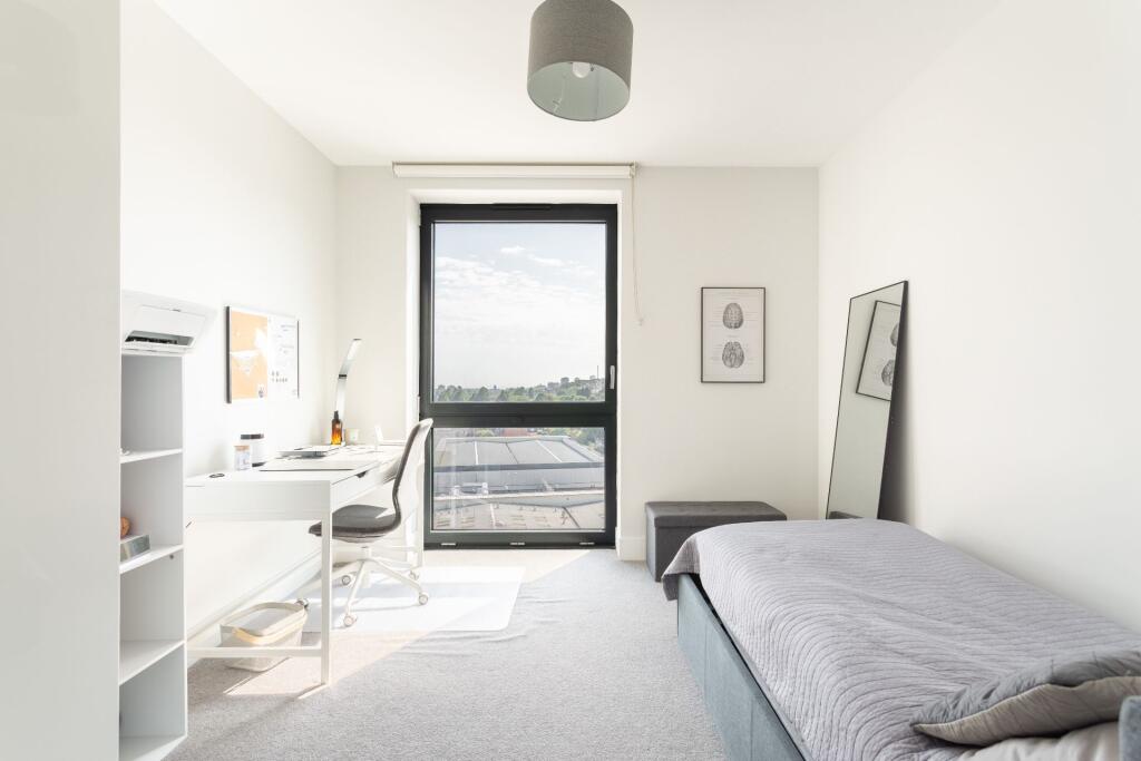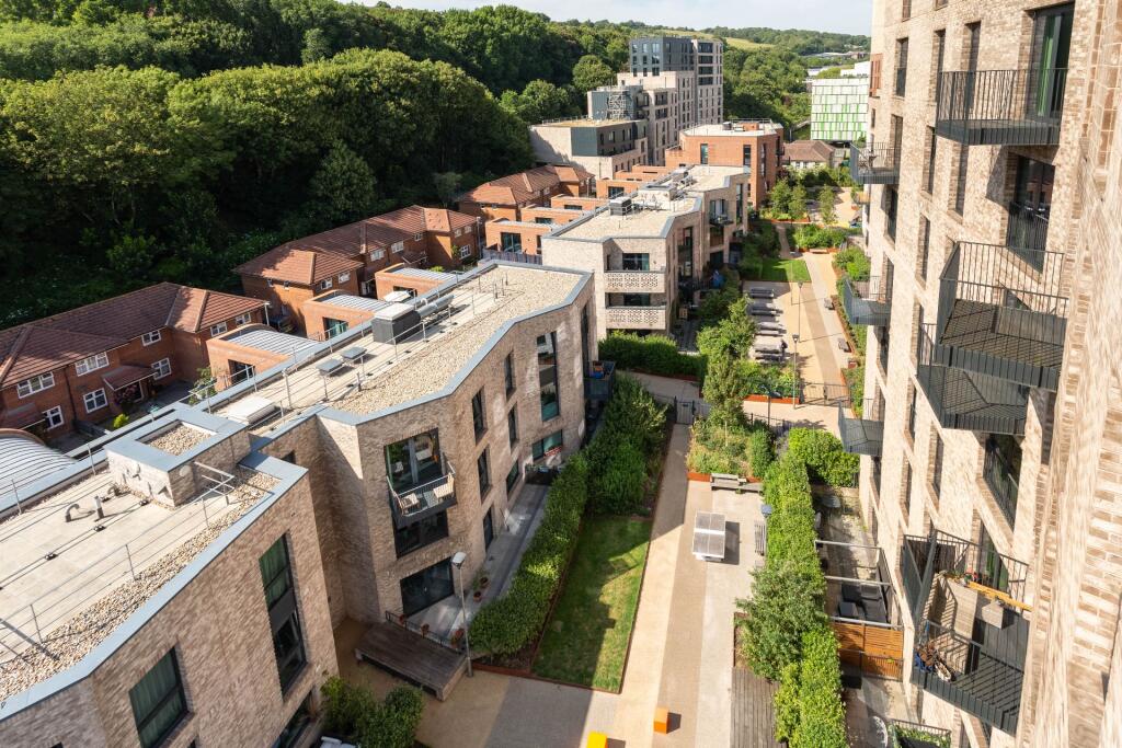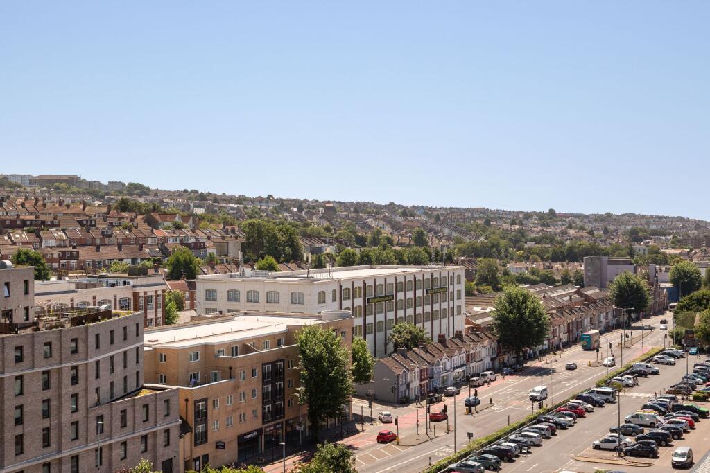 Set high above the city on the eighth floor of a contemporary development just off Lewes Road, this beautifully finished two-bedroom apartment offers calm, light-filled living with panoramic views stretching out towards the sea.