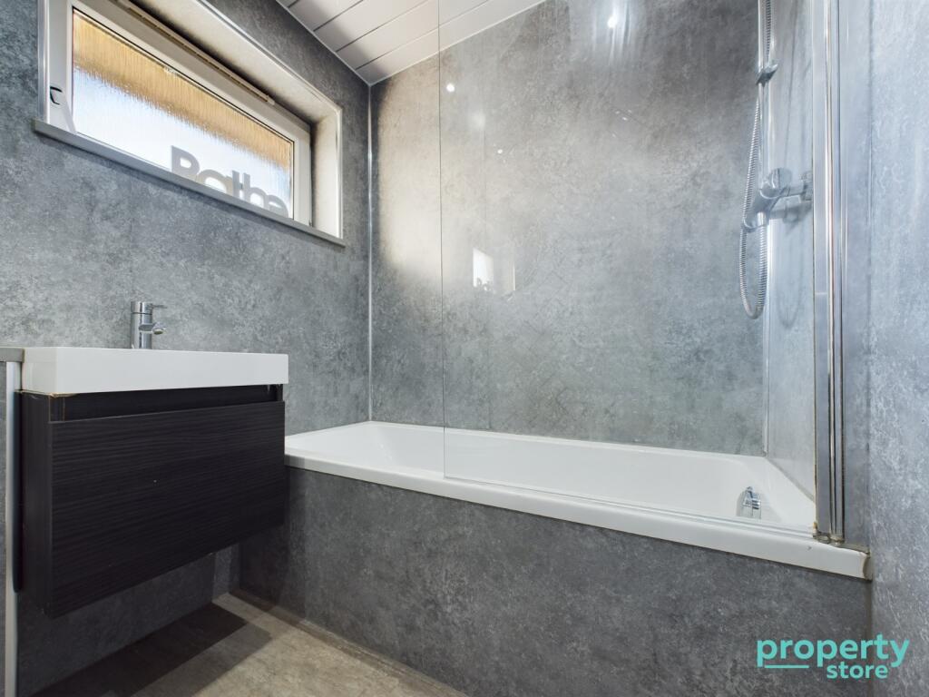 This three-bedroom terraced house in East Kilbride, South Lanarkshire offers a modern and well-presented interior. The kitchen and bathrooms have clearly been recently renovated to a high standard, creating a contemporary and stylish living space. The flooring is consistent throughout, creating a feeling of spaciousness. The property benefits from a small, manageable garden with decking, providing some outdoor space.