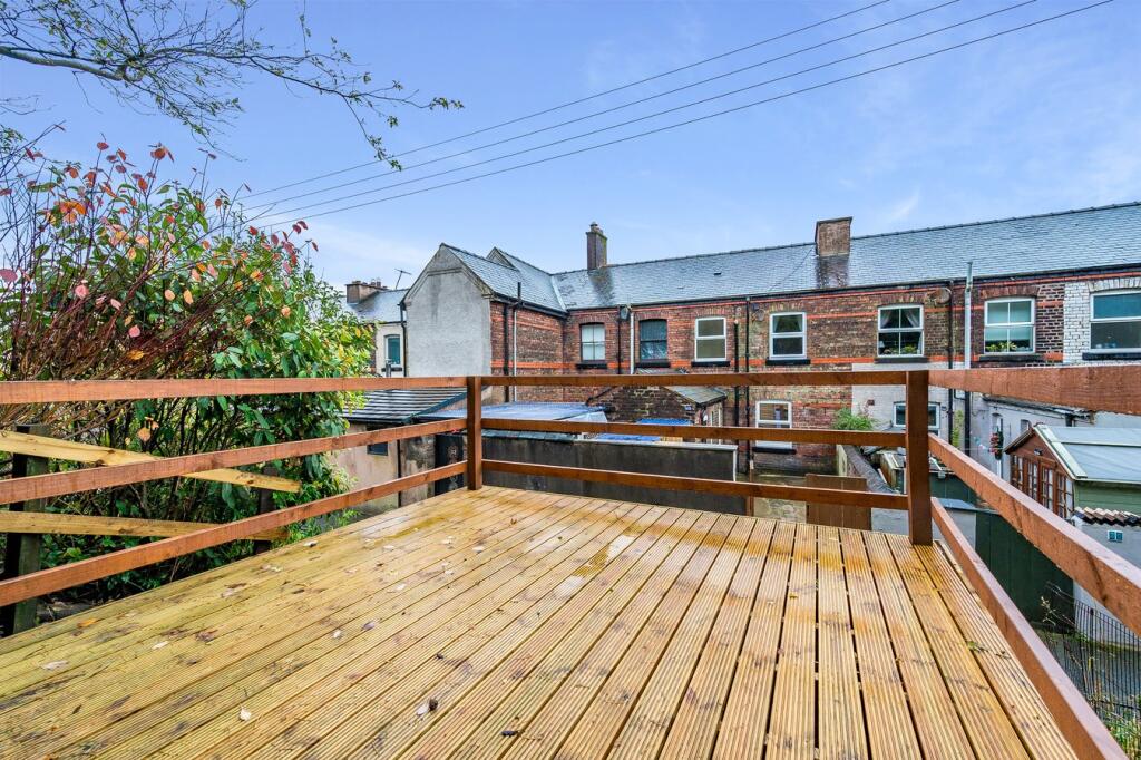 While the images show a recently modernised interior, the exterior and garden area appear relatively small. The garden is tiered and includes a wooden deck and a small shed. The lack of information regarding the square footage of the property and plot prevents a precise assessment of land size and value per square foot.