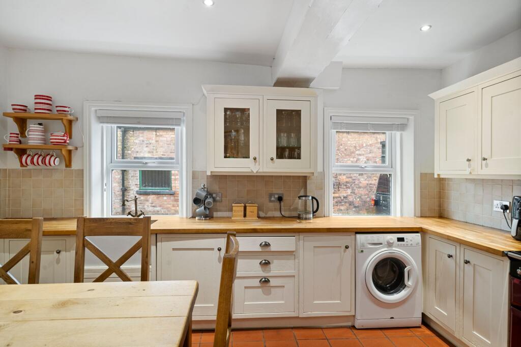 Stunning former coach house in Knowsley Village with three double bedrooms, two reception rooms, modern kitchen, mature gardens, private drive, and outbuildings. Semi-rural location.