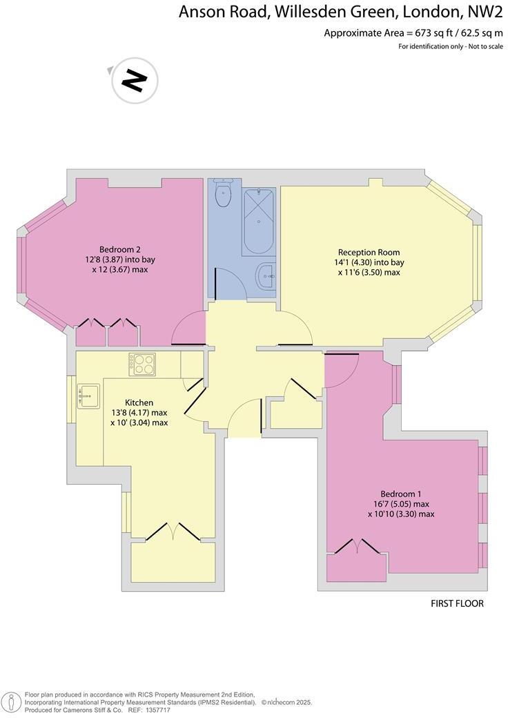 This is a two-bedroom flat on Anson Road in Mapesbury, London. The property is listed for £475,000 by Camerons Stiff & Co. The flat has one bathroom and is 57.13 square feet. The location is convenient, with Anson Primary School nearby and Cricklewood station within walking distance. While the property appears to be in reasonable condition, some modernisation could improve its appeal. The price seems fair considering the location and size of the flat. There is no garden.