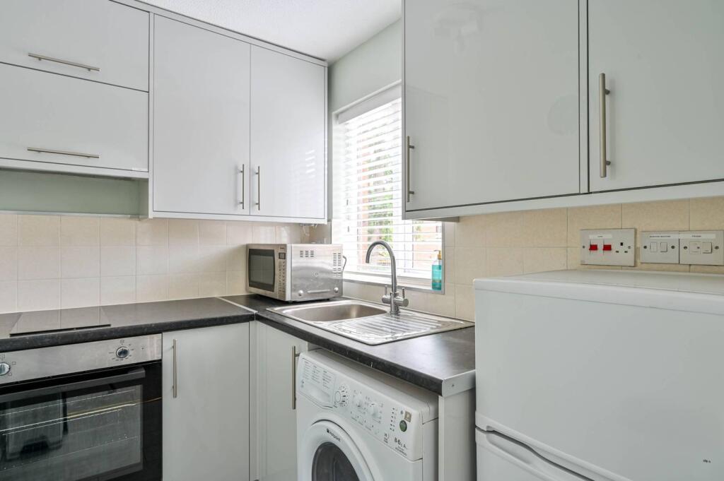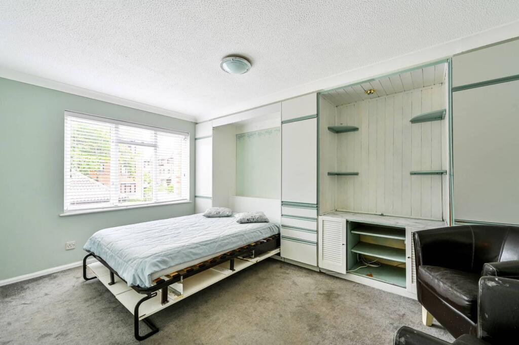Lovely and bright studio flat, situated on the first floor and enjoying a spacious studio room with fold-away wall bed, separate kitchen and off-street parking.